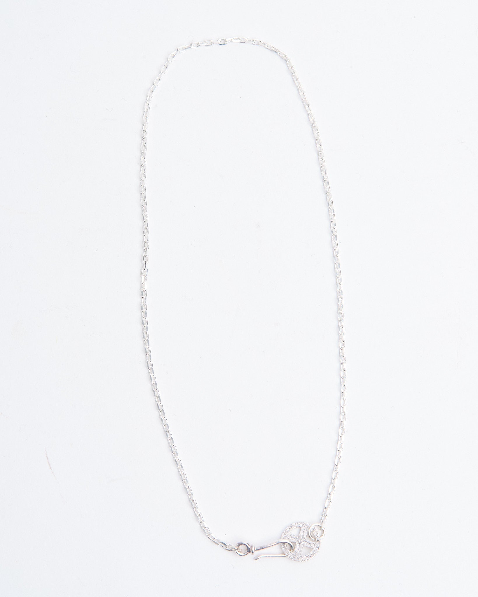 Paired with a 55cm silver chain, this necklace is ready to wear straight out of the box. First Arrows apply their exclusive heat-treatment process to strengthen the silver, improving durability while maintaining a clear, refined surface. Over time, the silver will naturally darken and develop patina, giving the piece greater depth and individuality.