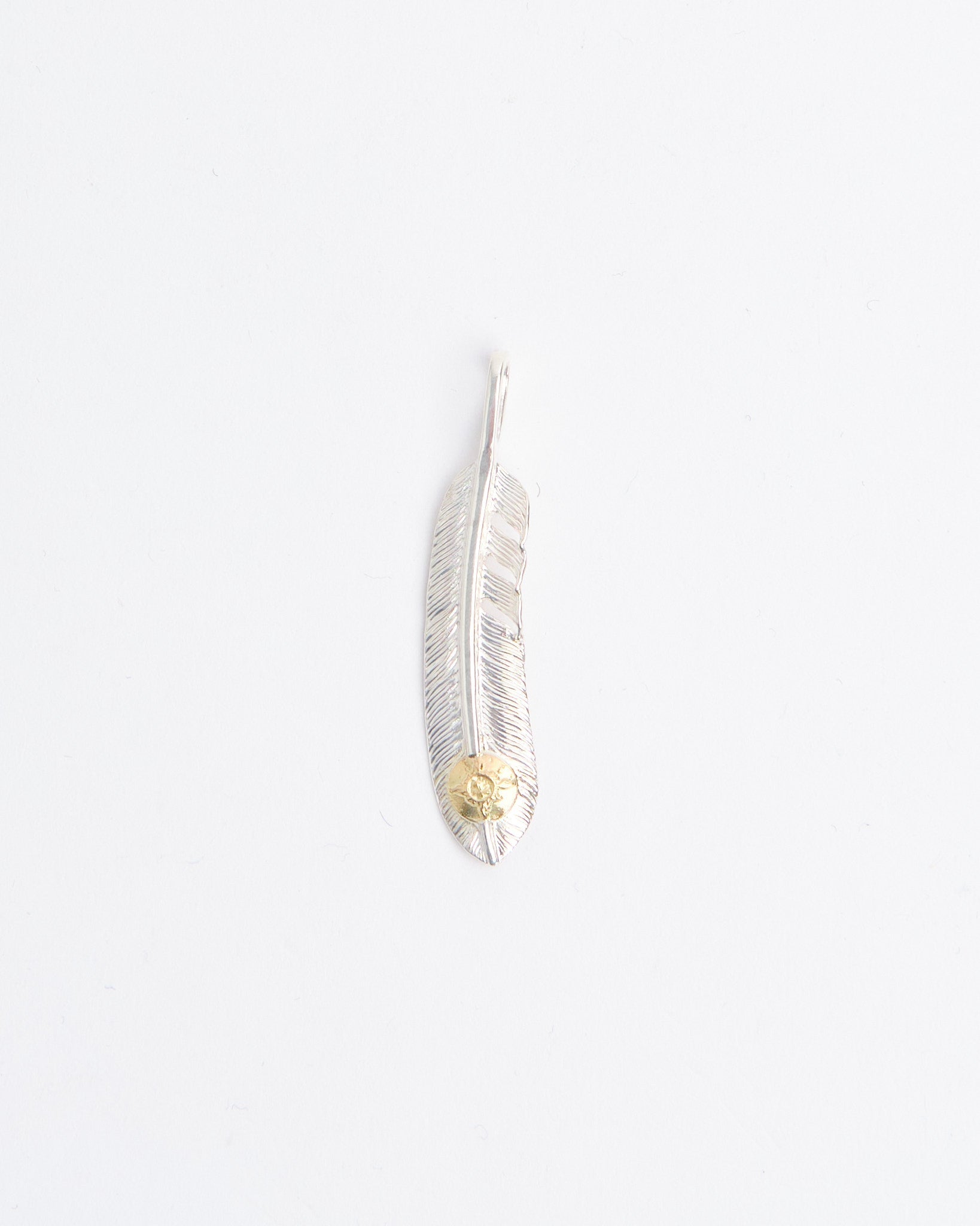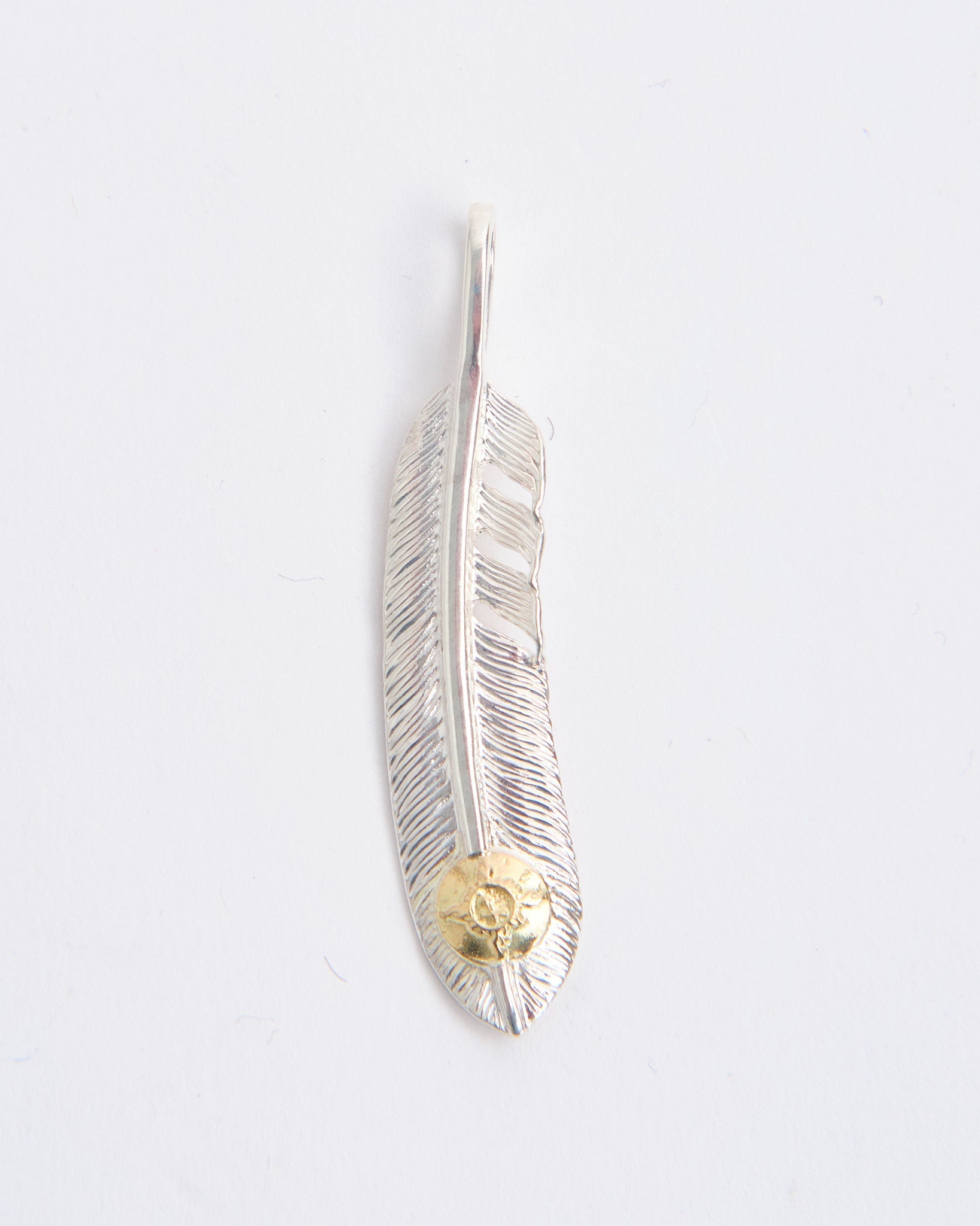 The Feather (M) with K18 brings together First Arrows’ iconic feather motif with the warmth of gold detail. Handcrafted in Japan from Britannia Silver 950, the medium-sized feather represents freedom, hope, and positive energy, inspired by Native American tradition but elevated with refined Japanese craft. A touch of 18k yellow gold provides striking contrast against the silver, which is strengthened with First Arrows’ unique heat-treatment process for lasting durability. With time, the silver will develop a rich patina, making the gold accent stand out even more. Balanced in size, this pendant works perfectly on its own or layered with other feathers and motifs, growing more personal with every wear.