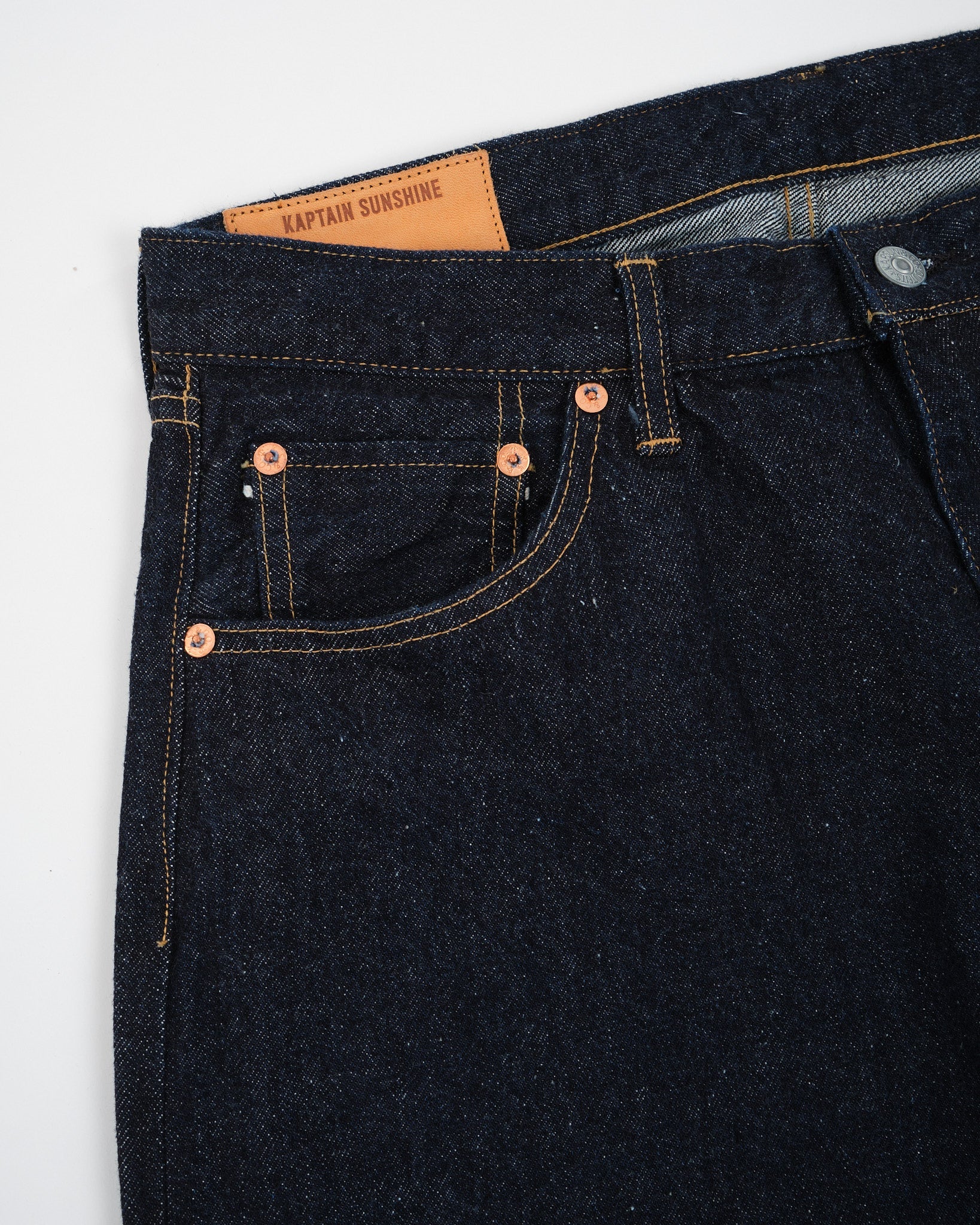 Le Kaptain Sunshine 5P Pantalon de jean avant à glissière (KSBS101DZ) dans Indigo un lavage sont un exemple parfait de l'artisanat de premier plan. À partir de 13,5 onces de lim, ces pantalons sont tesés avec pur indigo et caractéristique NEP naturel grâce à l'utilisation de Coton de San Joaquin de haute qualité, provenant d'une zone de production de coton de riz bien établie.