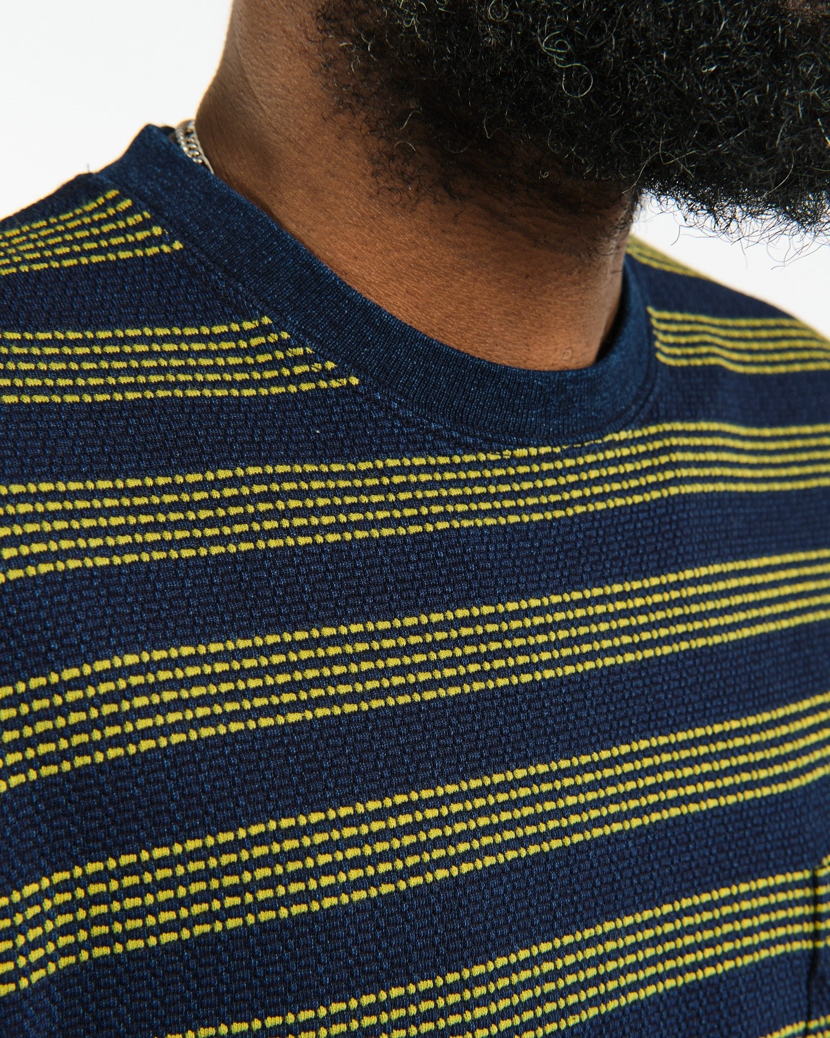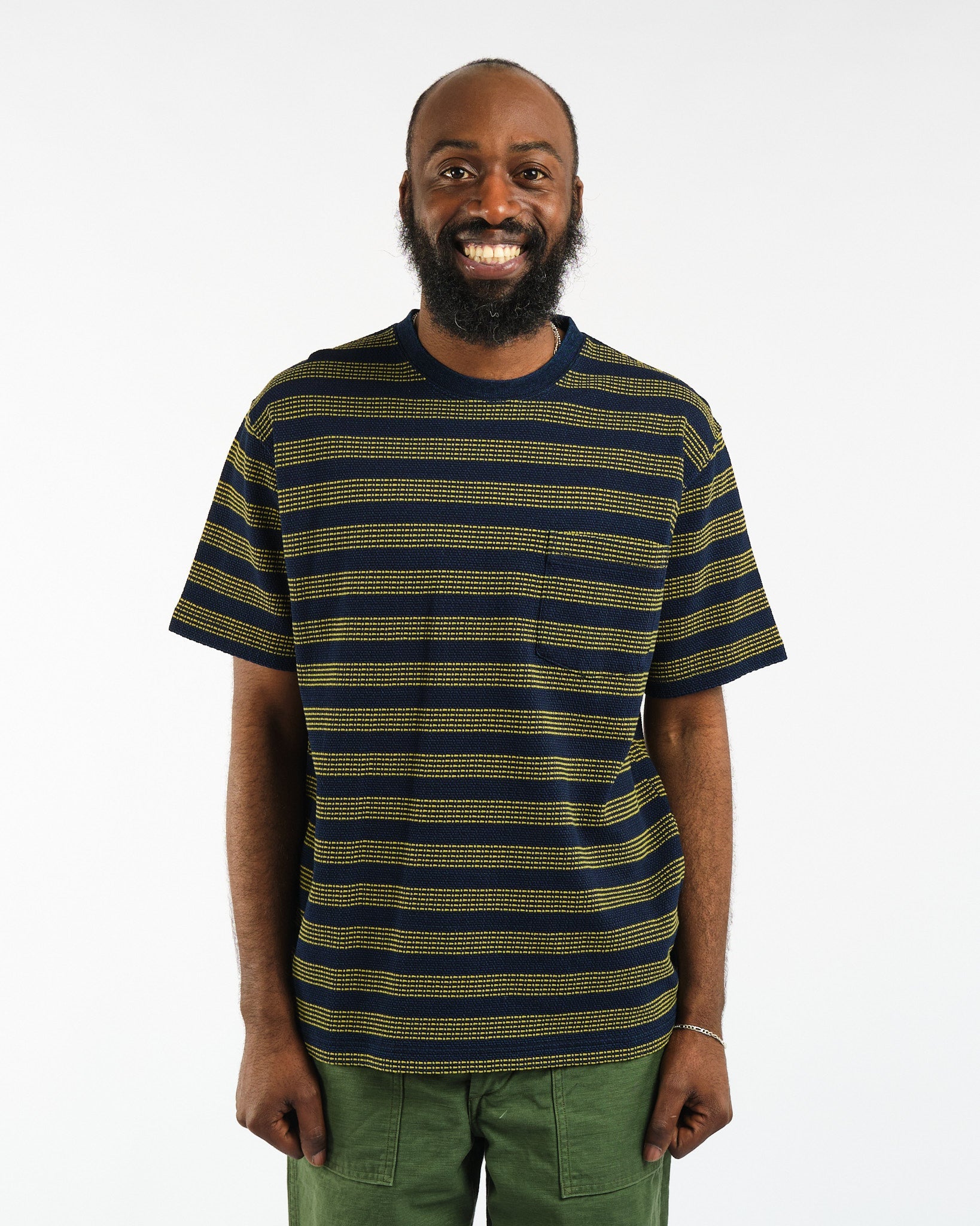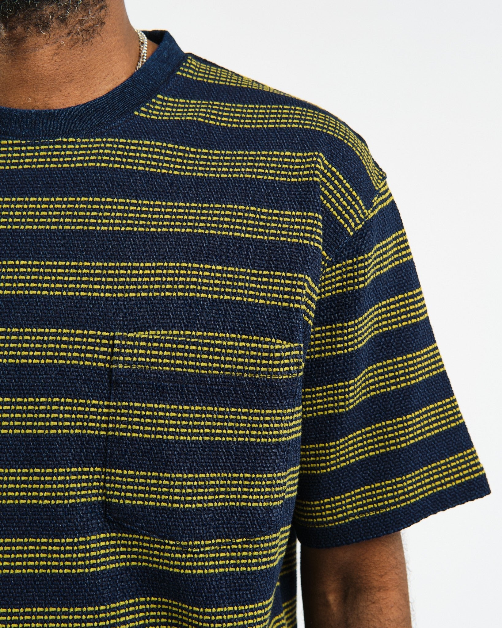 Présentation des poutres + Pocket Tee INDIGO Pique Jaune - Un tee-shirt tissé élégant et confortable avec un ajustement régulier, parfait pour les vêtements de tous les jours. Doté d'un motif de bande tout-côté dans une teinte jaune vibrante, ce tee est fabriqué à partir de 100% coton pour un confort et une respirabilité ultimes. La poche de poitrine ajoute une touche fonctionnelle à cette pièce à la mode, ce qui en fait un ajout incontournable à votre garde-robe.