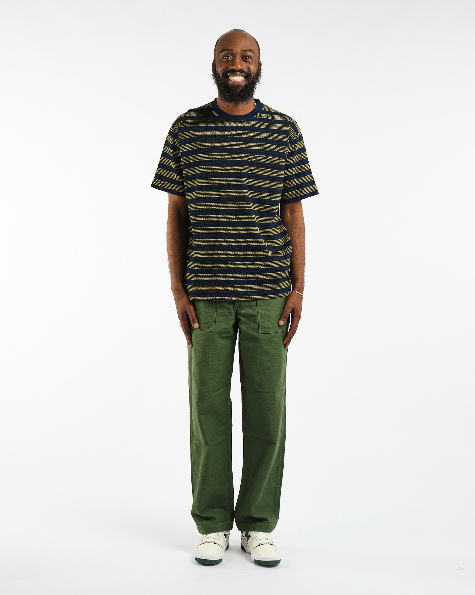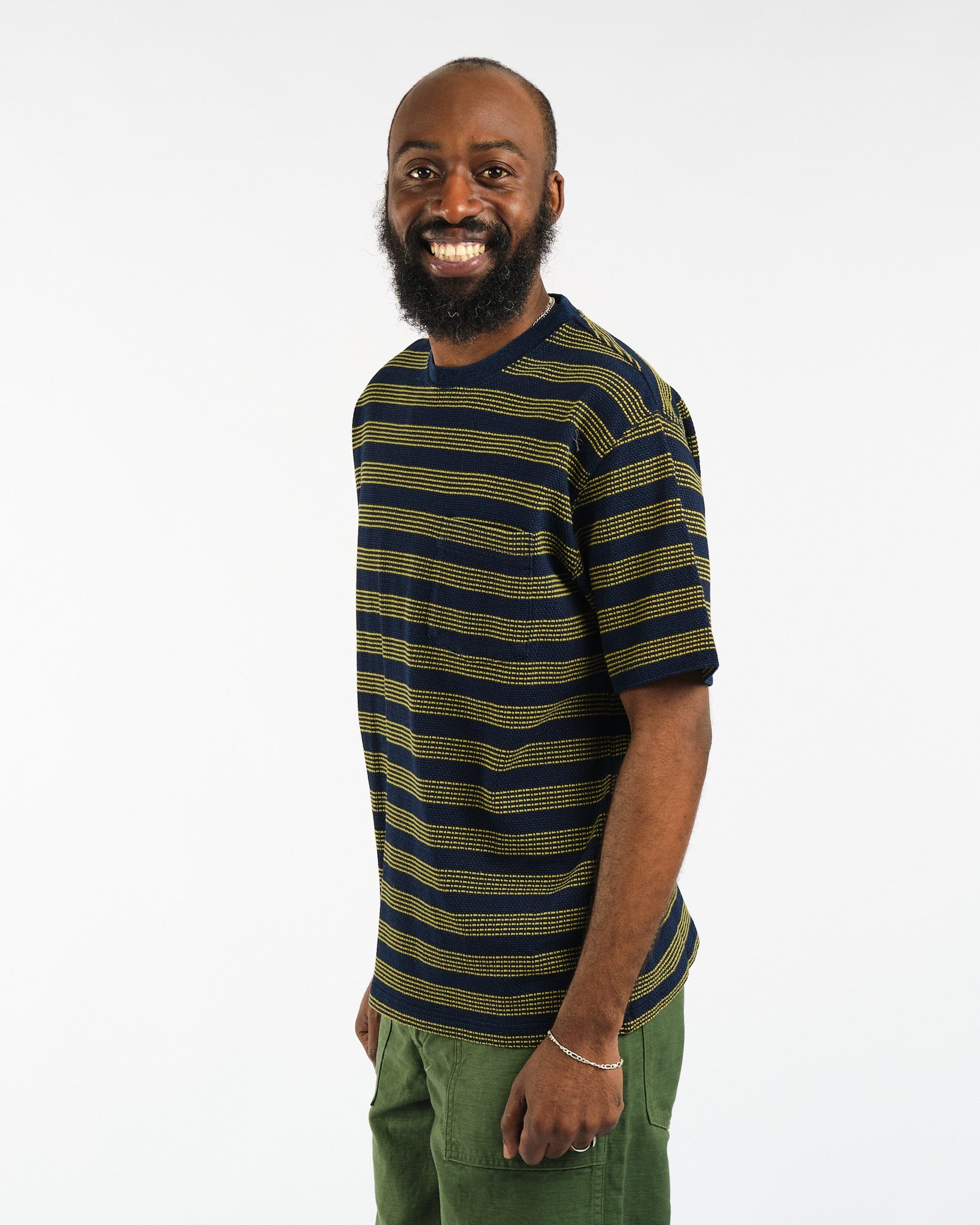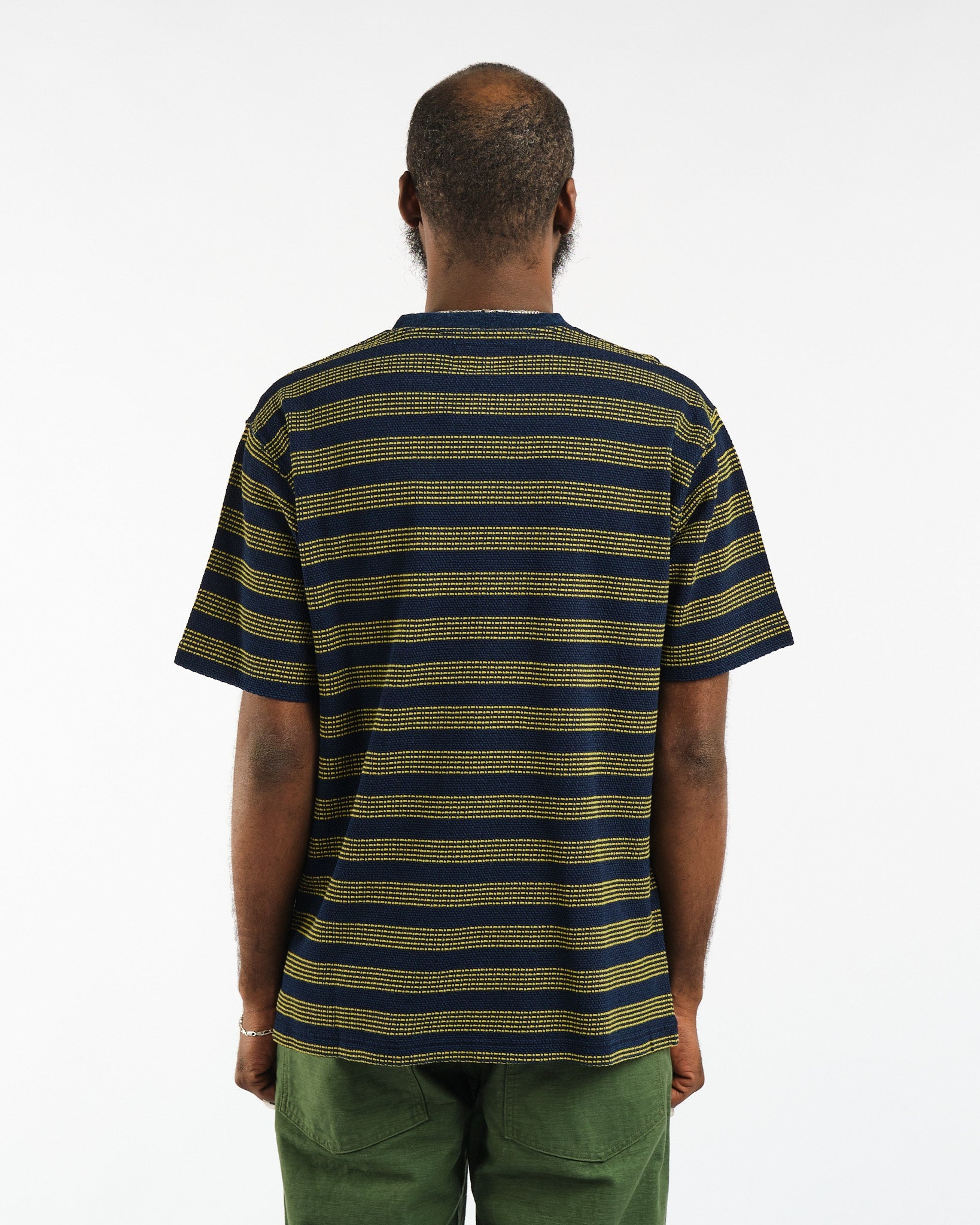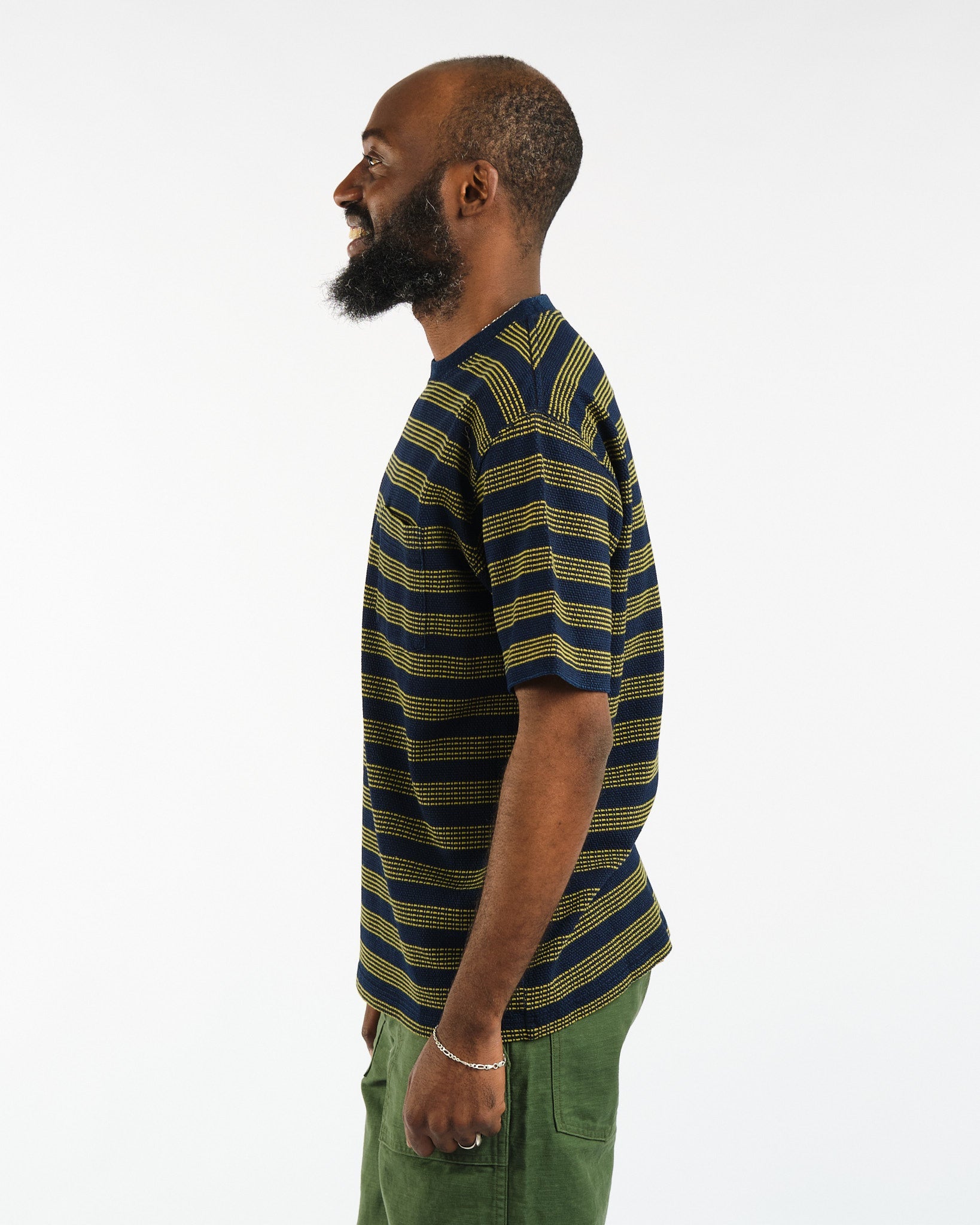 Présentation des poutres + Pocket Tee INDIGO Pique Jaune - Un tee-shirt tissé élégant et confortable avec un ajustement régulier, parfait pour les vêtements de tous les jours. Doté d'un motif de bande tout-côté dans une teinte jaune vibrante, ce tee est fabriqué à partir de 100% coton pour un confort et une respirabilité ultimes. La poche de poitrine ajoute une touche fonctionnelle à cette pièce à la mode, ce qui en fait un ajout incontournable à votre garde-robe.