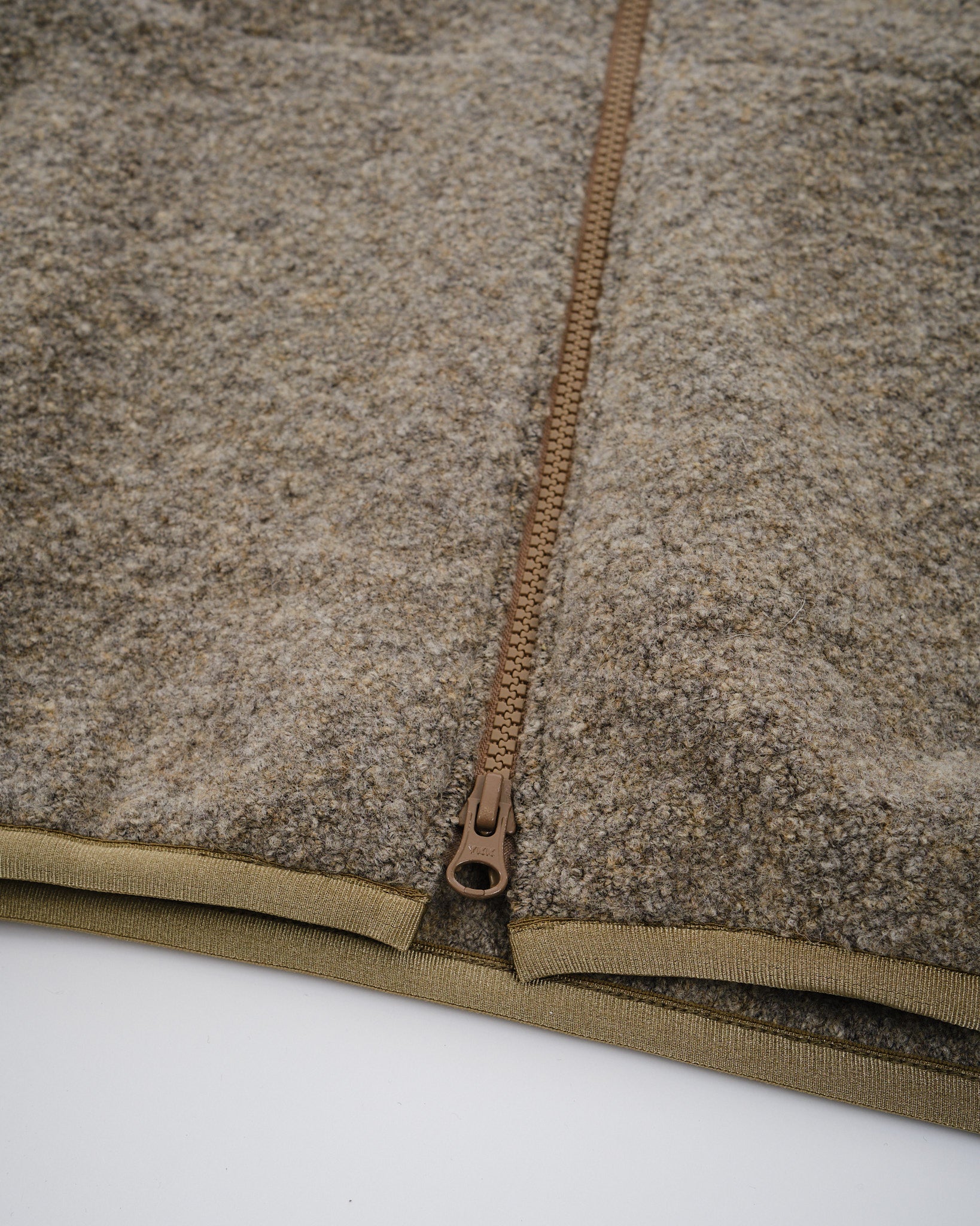 Offrez-vous une sensation nostalgique avec le pull à laine bouillie à la nanamica en coyote. Ce pull Zipå Up est méticuleusement conçu au Japon en utilisant une technique unique. Les fils en laine sont intentionnellement bouclés à la surface puis tricotés et rétrécis pour créer une texture qui ramène des souvenirs de vêtements en plein air classiques.