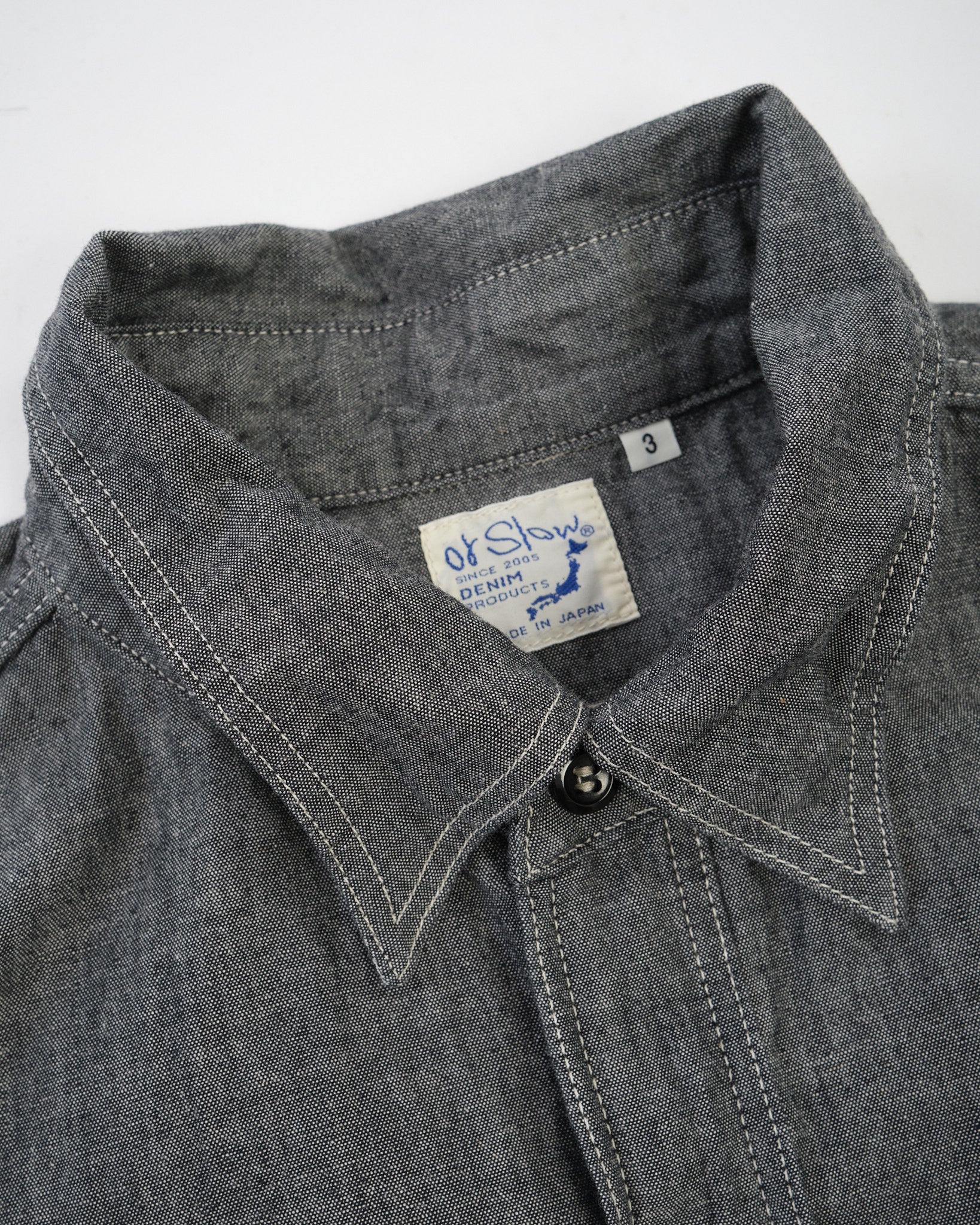 La coupe relax offre de l'espace au niveau des épaules et de la poitrine, tandis que des détails traditionnels—comme les poches poitrine symétriques, les goussets latéraux, et un ourlet renforcé—ancrent le design dans les inspirations archivistiques de orSlow. C'est une chemise faite pour être portée intensément, adoucie seulement par l'expérience.