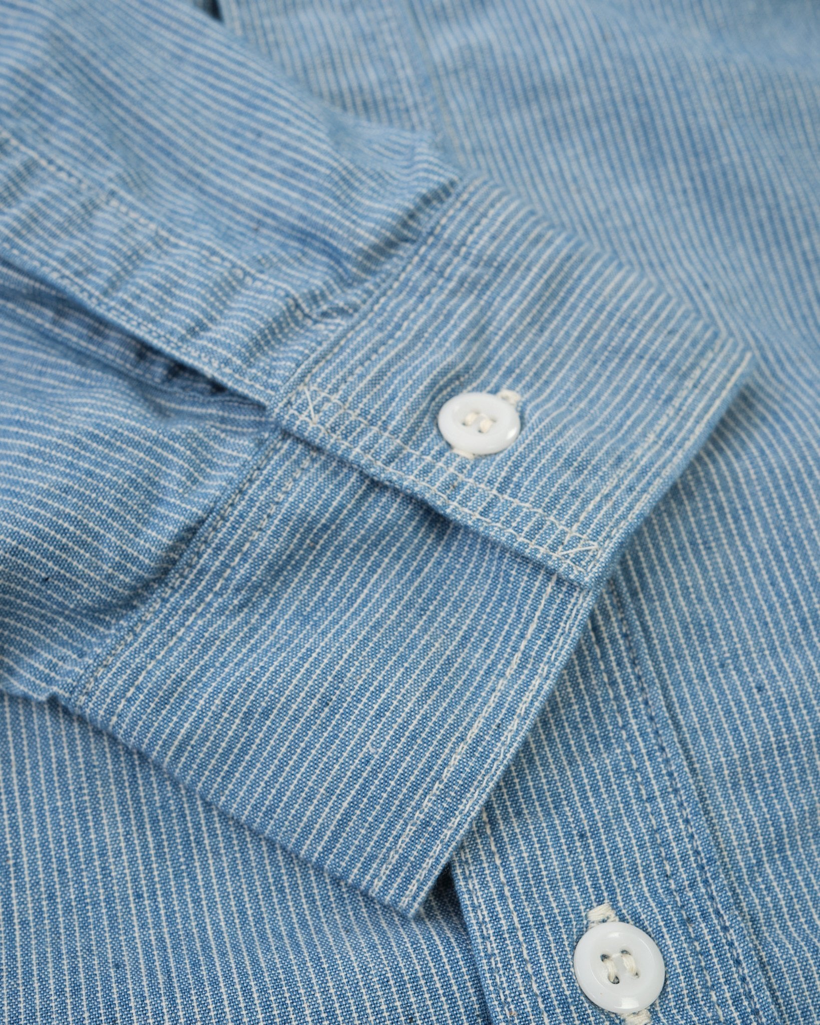 Le orSlow Chemise de travail en chambray à coupe relax à rayures met à jour une silhouette robuste avec une infusion subtile de motif. Coupé et cousu au Japon à partir du tissu chambray rayé original de orSlow, cette pièce mélange le charme utilitaire avec une sophistication discrète.