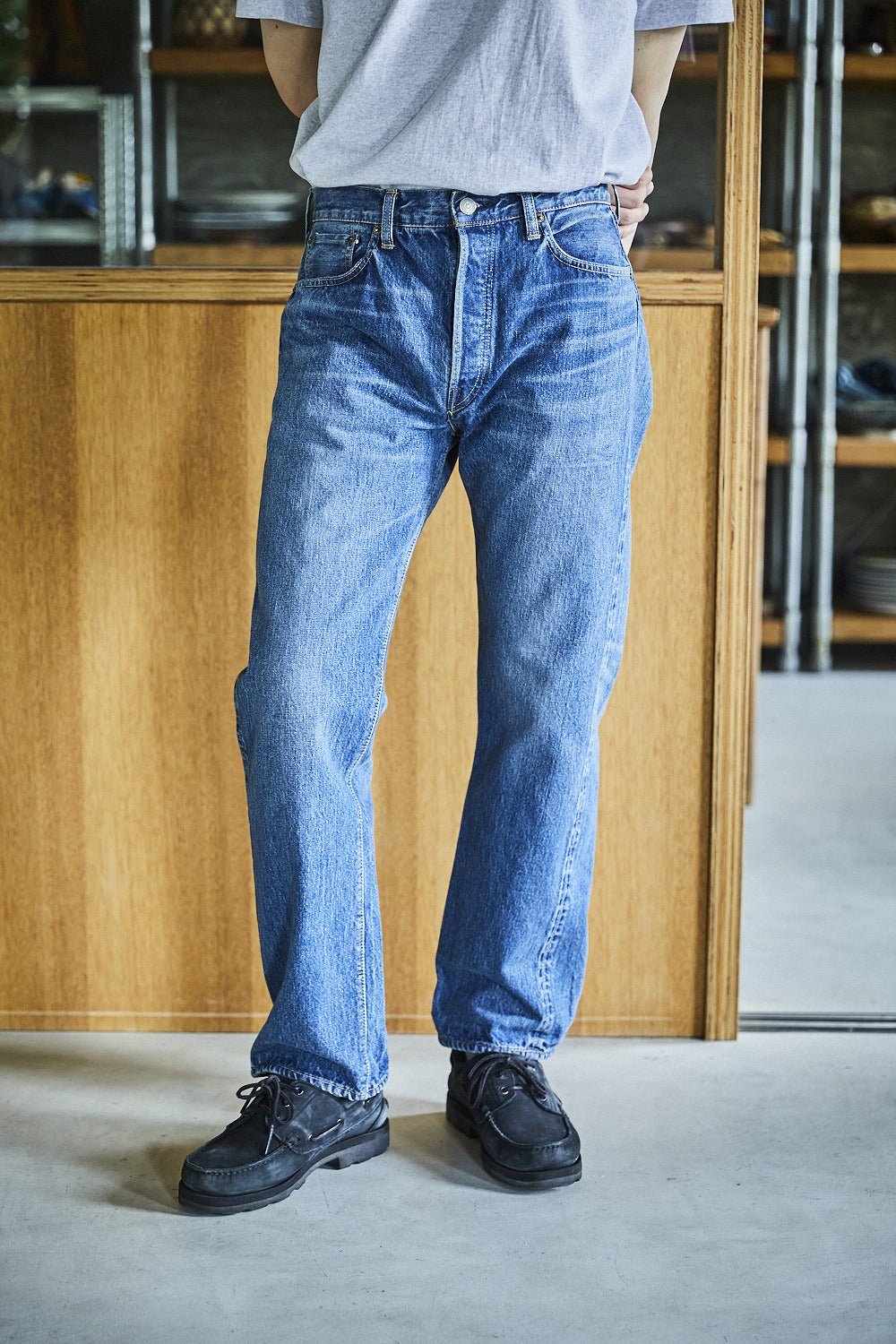 Avec une longueur de jambe plus courte et une coupe droite classique, il est parfait pour ceux qui préfèrent une longueur raccourcie sans compromis sur la proportion. Le ton indigo délavé imite la douceur et les moustaches qui viennent de l'usure quotidienne, tandis que les détails traditionnels comme la braguette à boutons, les rivets oxydés, la couture cachée de la poche arrière, et la poche à monnaie selvedge restent fidèles à l'inspiration vintage.