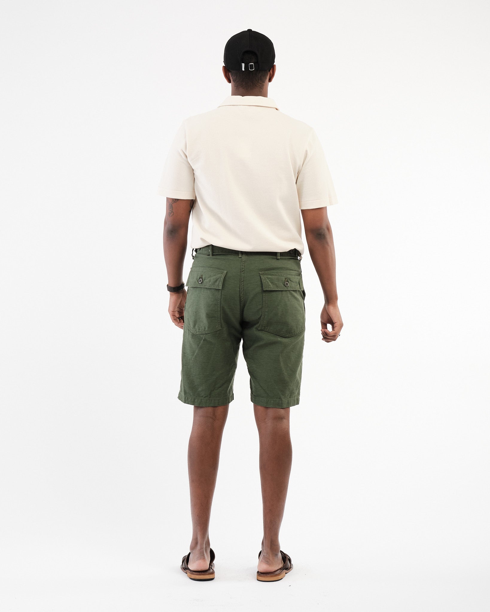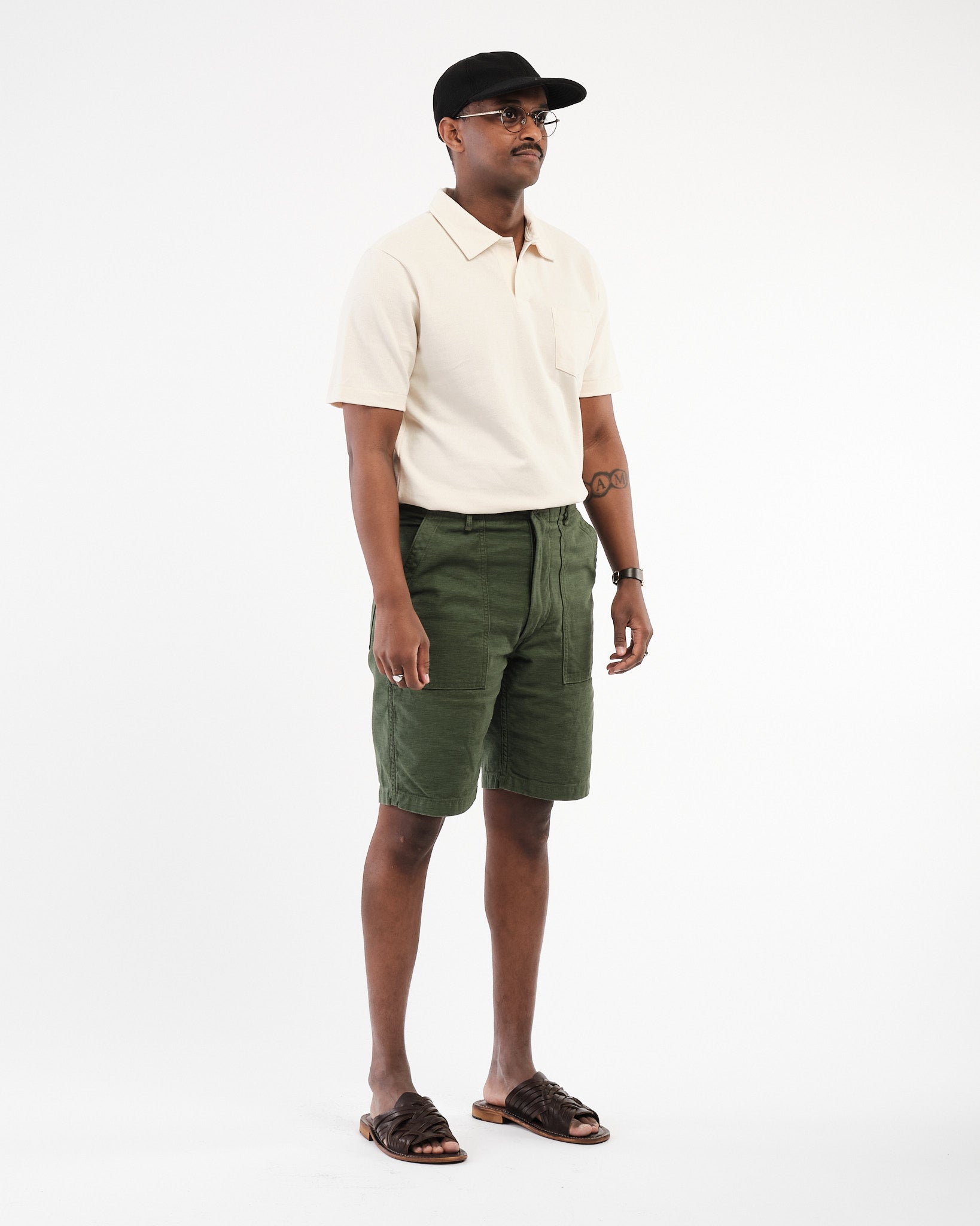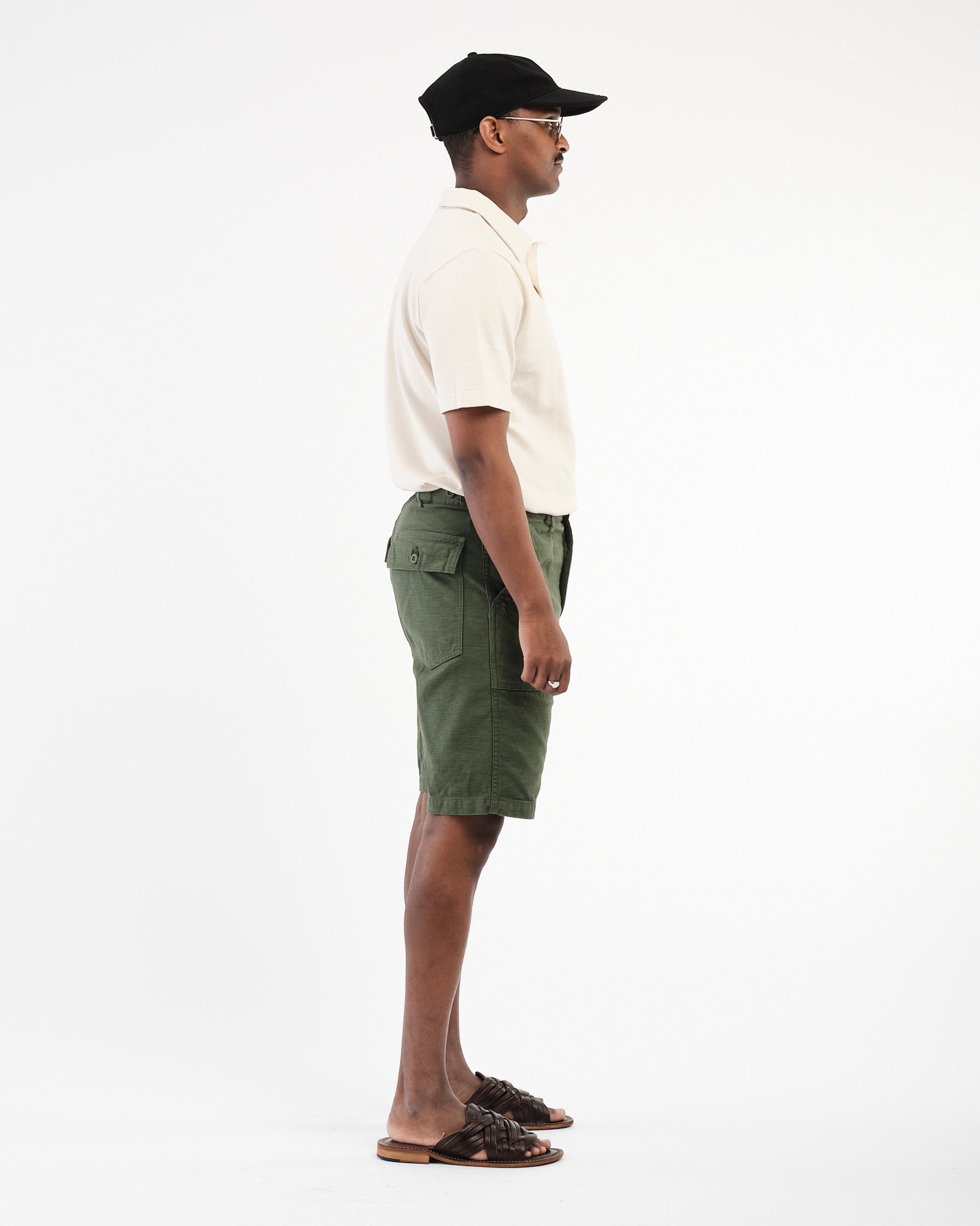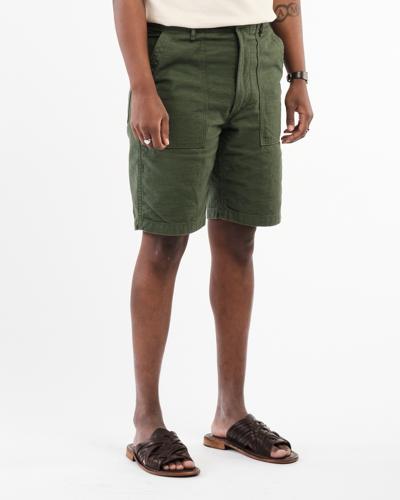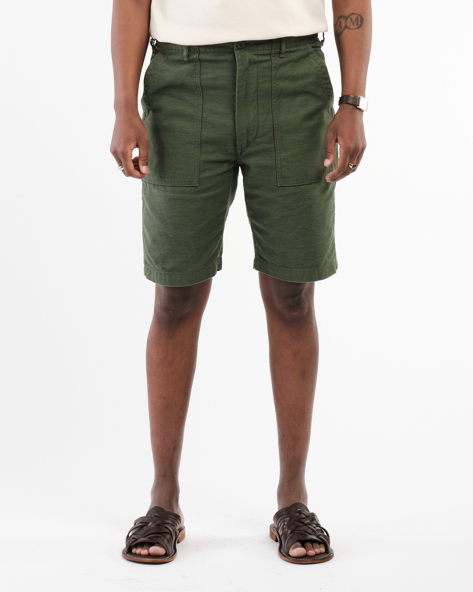 Obtenez l'ambiance classique des vêtements de travail avec une touche en short de fatigue de l'armée américaine Orslows en vert. Depuis 2005, Orslow a créé des vêtements au Japon en se concentrant sur la réinterprétation des pièces d'un point de vue contemporain plutôt que de les reproduire. Leur point de vue sur le short de fatigue classique conserve la coupe de pantalon de fatigue mais l'adapte dans une version plus courte adaptée au temps plus chaud. Ces shorts sont fabriqués à partir de tissu de coton-satin qui est fabriqué aujourd'hui en utilisant les techniques comme au milieu du 20e siècle. Ils sont livrés avec des poches de patch sur les volets de poche en forme carrée qui couvrent les poches arrière. Les détails fonctionnels comme les boucles de ceinture et les ajusteurs latéraux sur les hanches garantissent un ajustement tandis que le tissu pré-lavé garantit que les shorts maintiendront leur forme et leur taille sans rétrécir .. Fabriqué au Japon Orslows, les shorts de fatigue de l'armée américaine mettent en valeur l'engagement des marques, à la construction de haute qualité, au confort et au style intemporel.