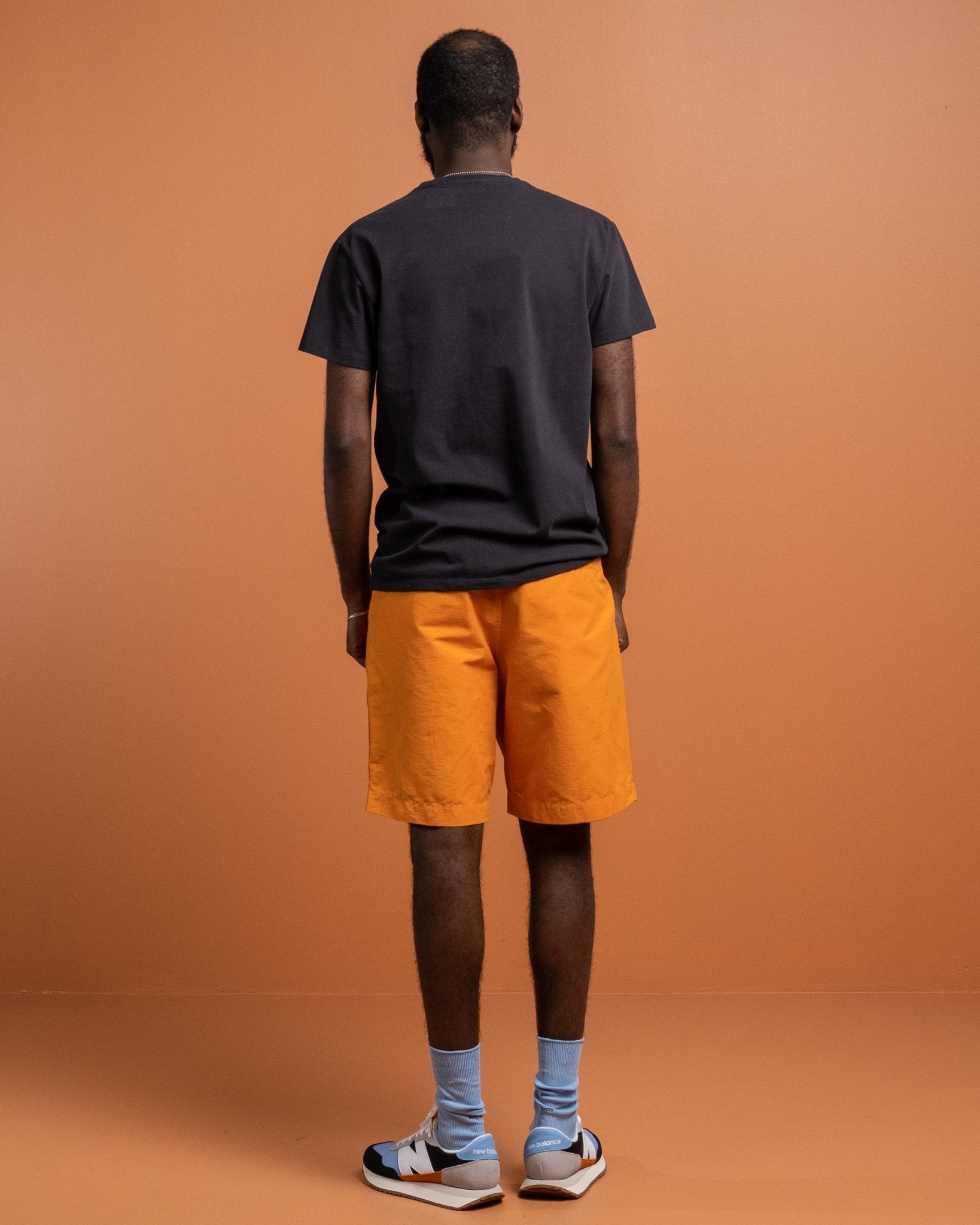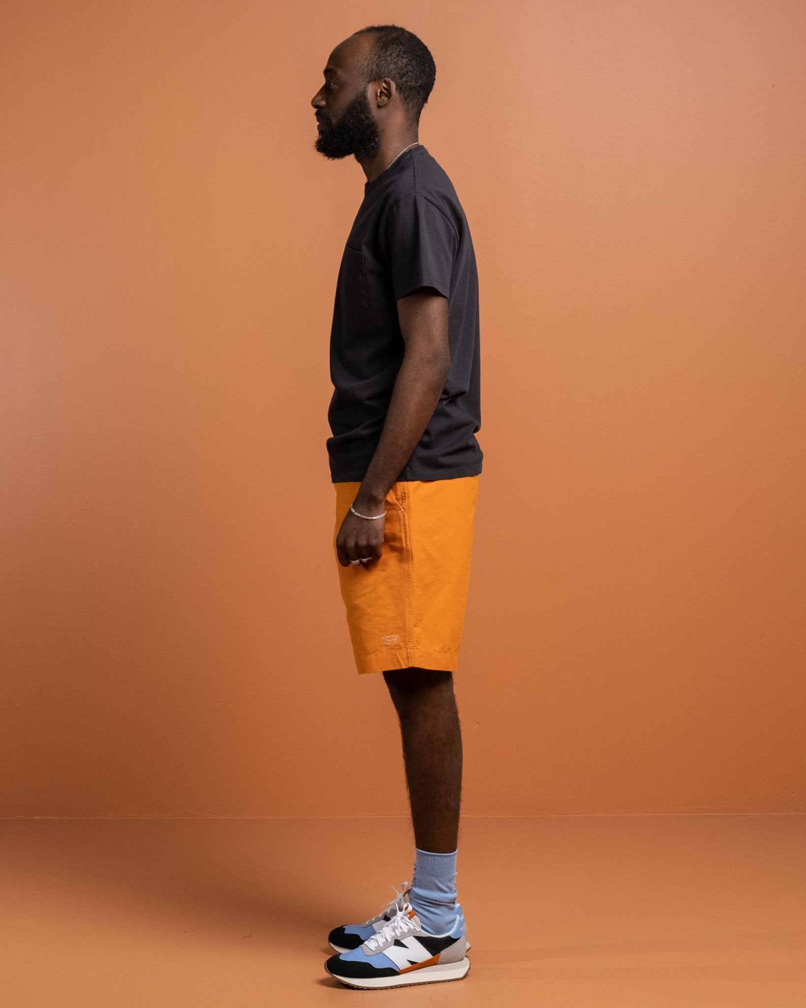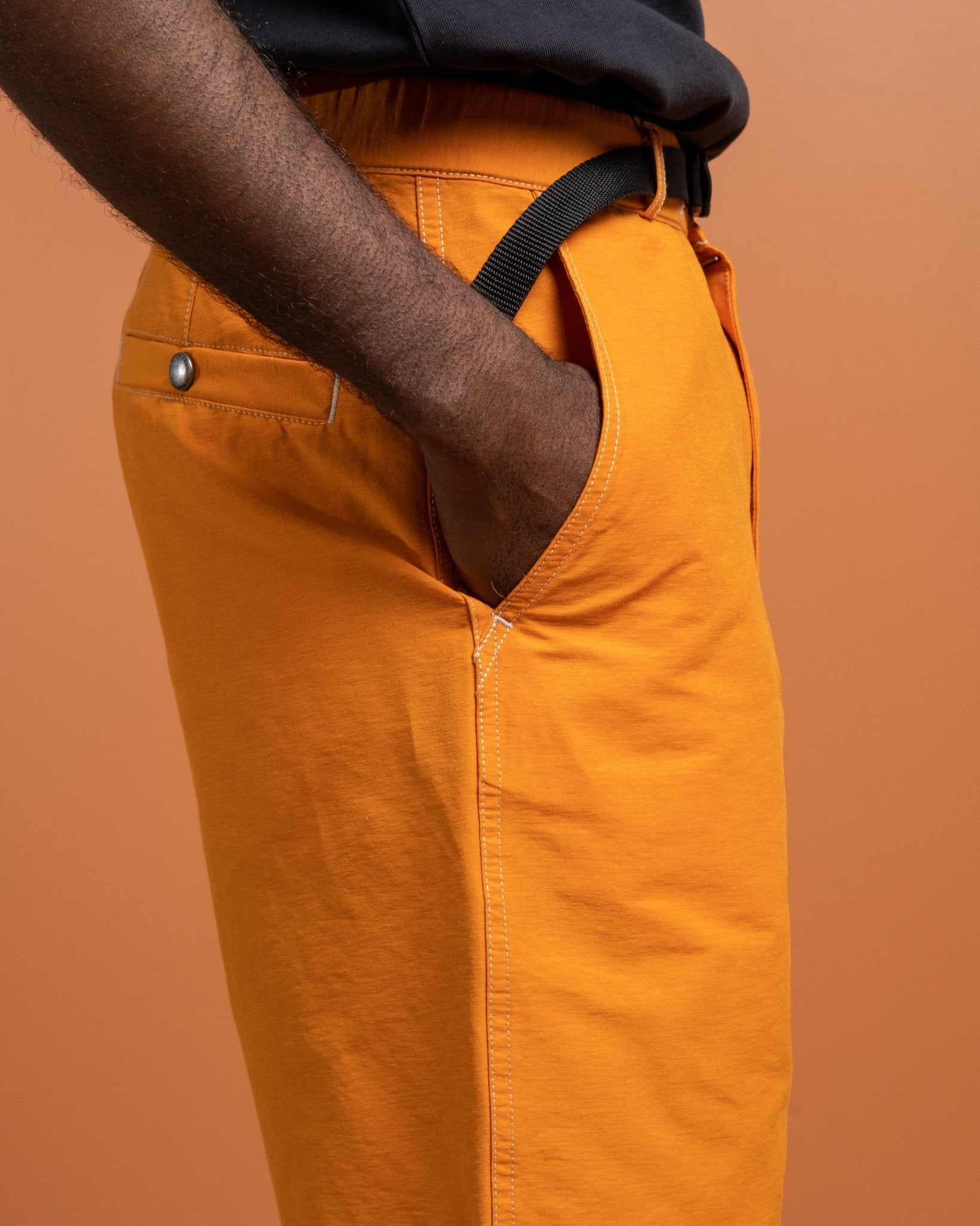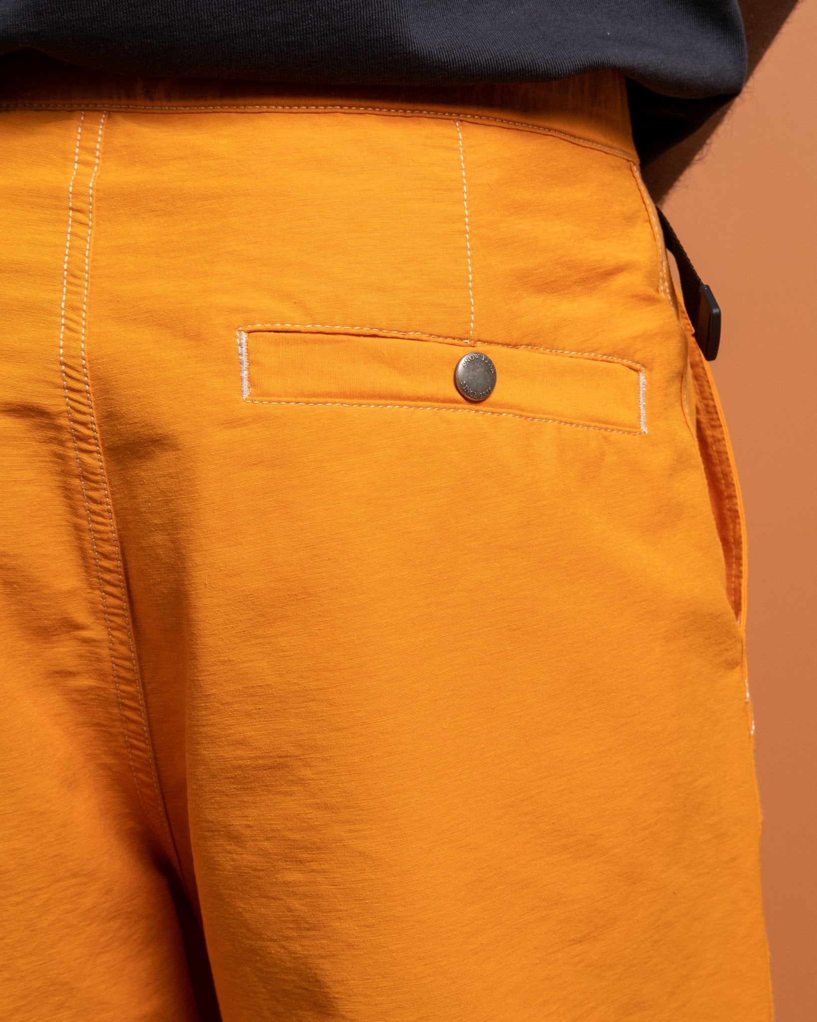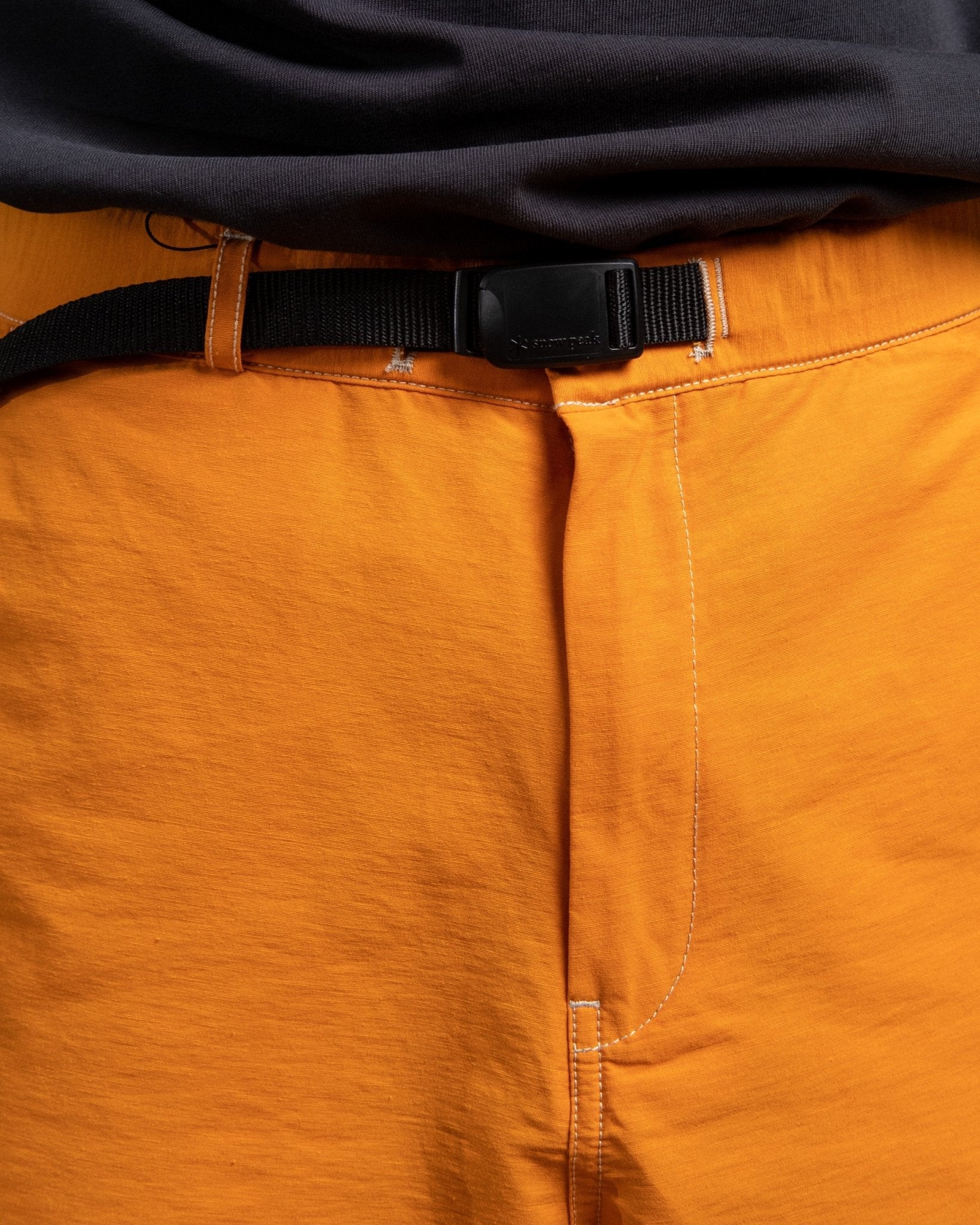 Shorts en tissu de montagne légers orange de Snow Peak. Shorts légers décontractés à base d'un mélange de coton / nylon. Avec une ceinture fixe, des poches côté latéral et arrière. Fabriqué en Chine.