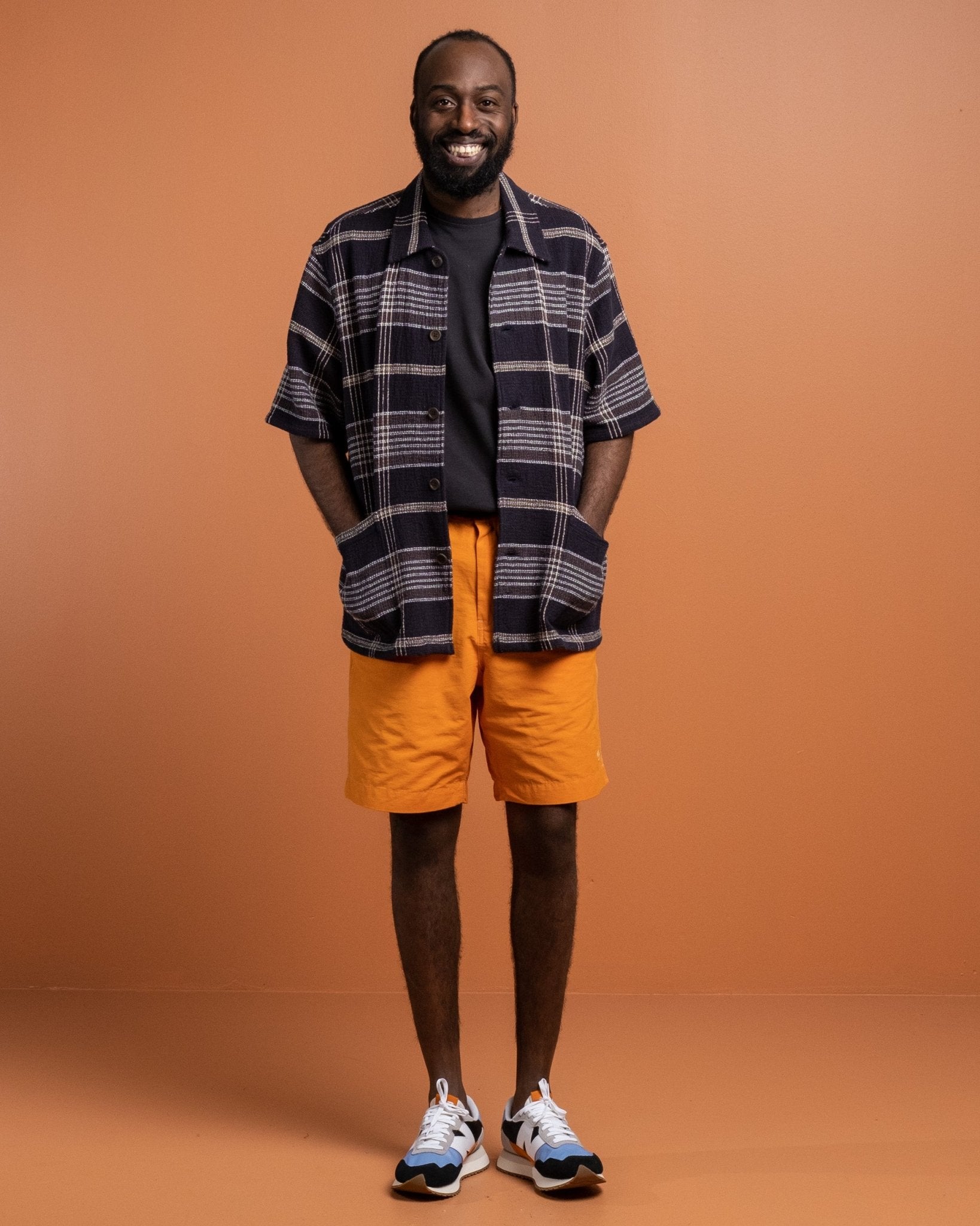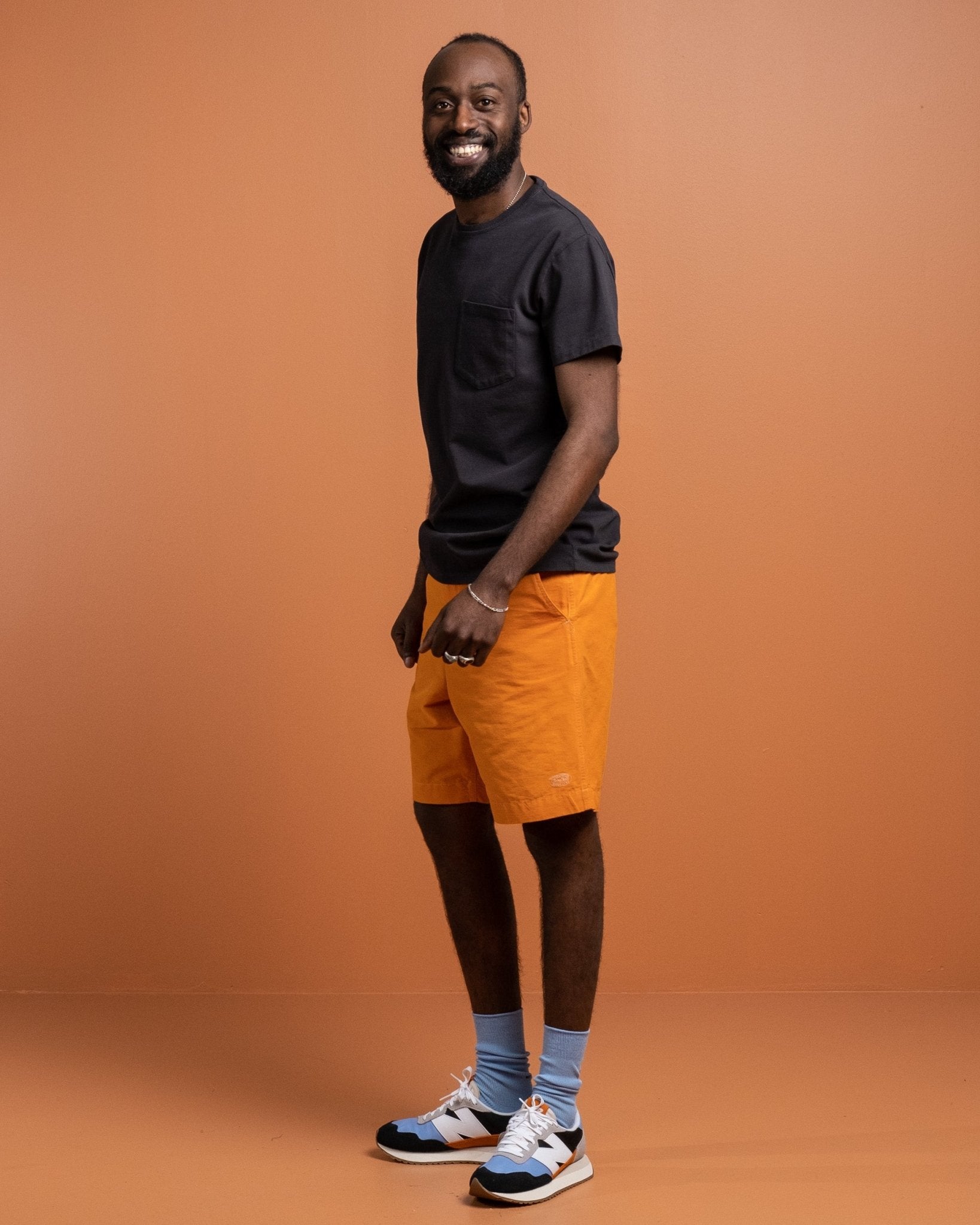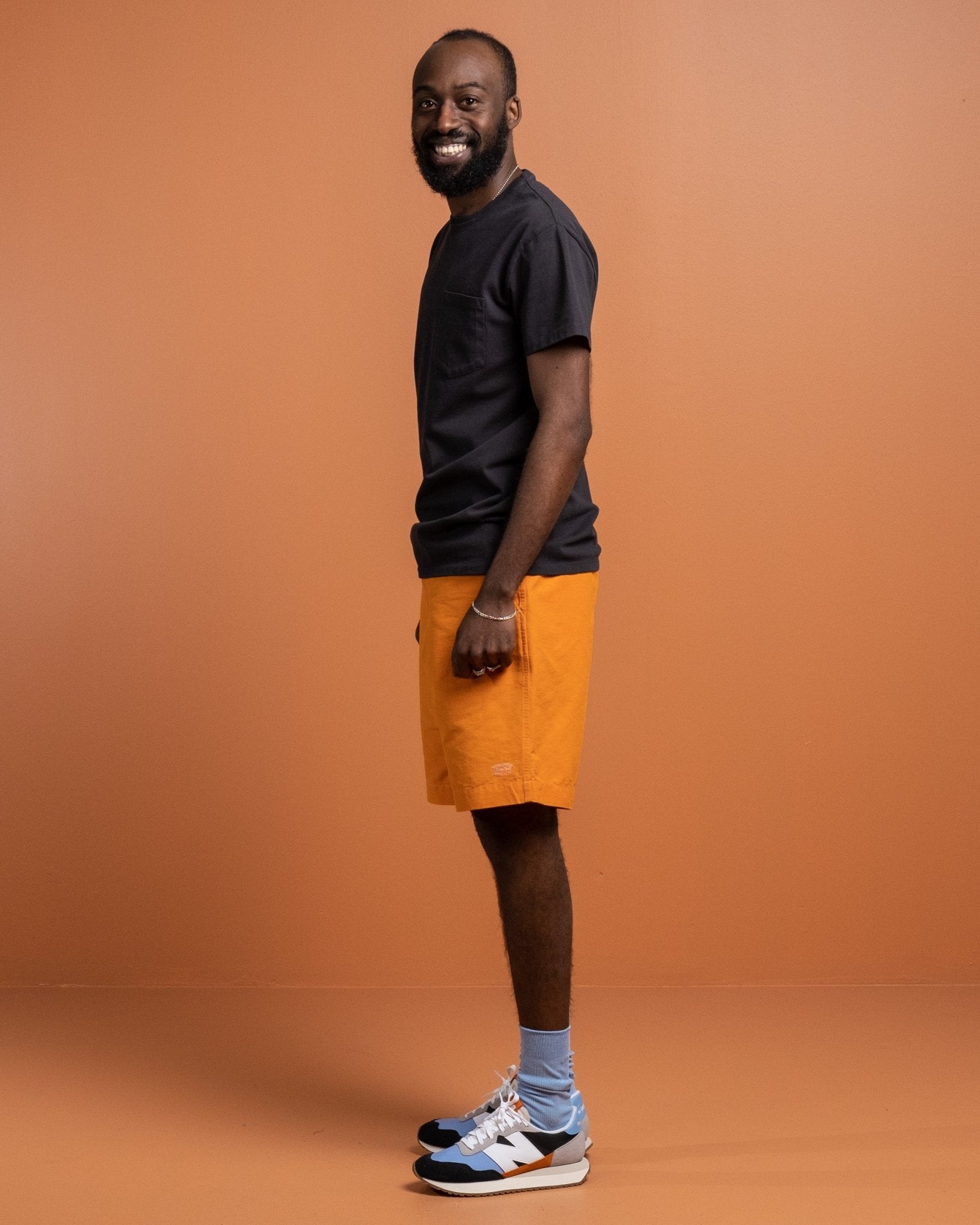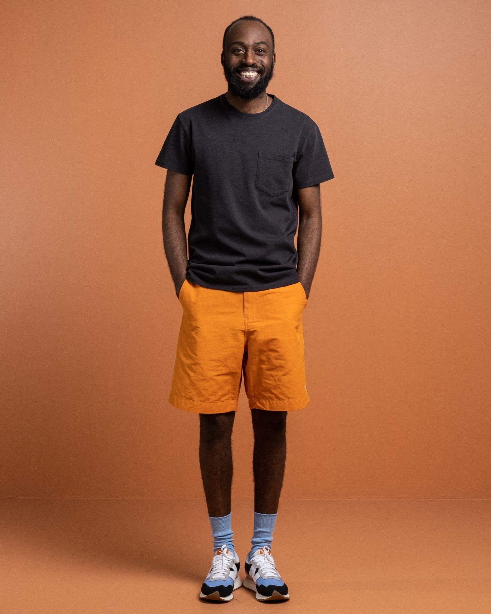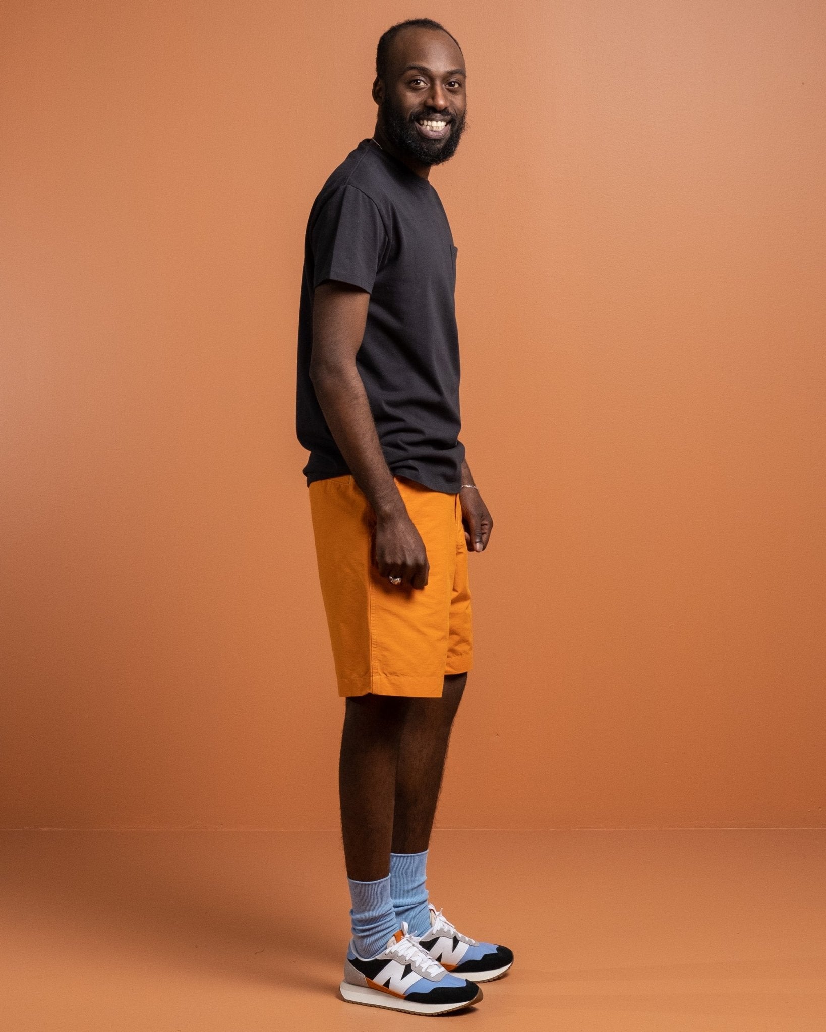 Shorts en tissu de montagne légers orange de Snow Peak. Shorts légers décontractés à base d'un mélange de coton / nylon. Avec une ceinture fixe, des poches côté latéral et arrière. Fabriqué en Chine.