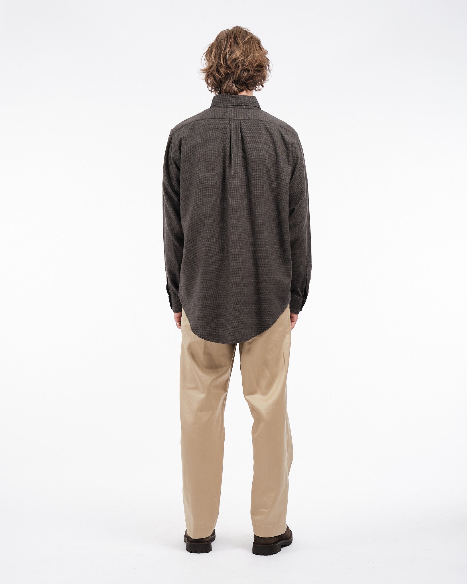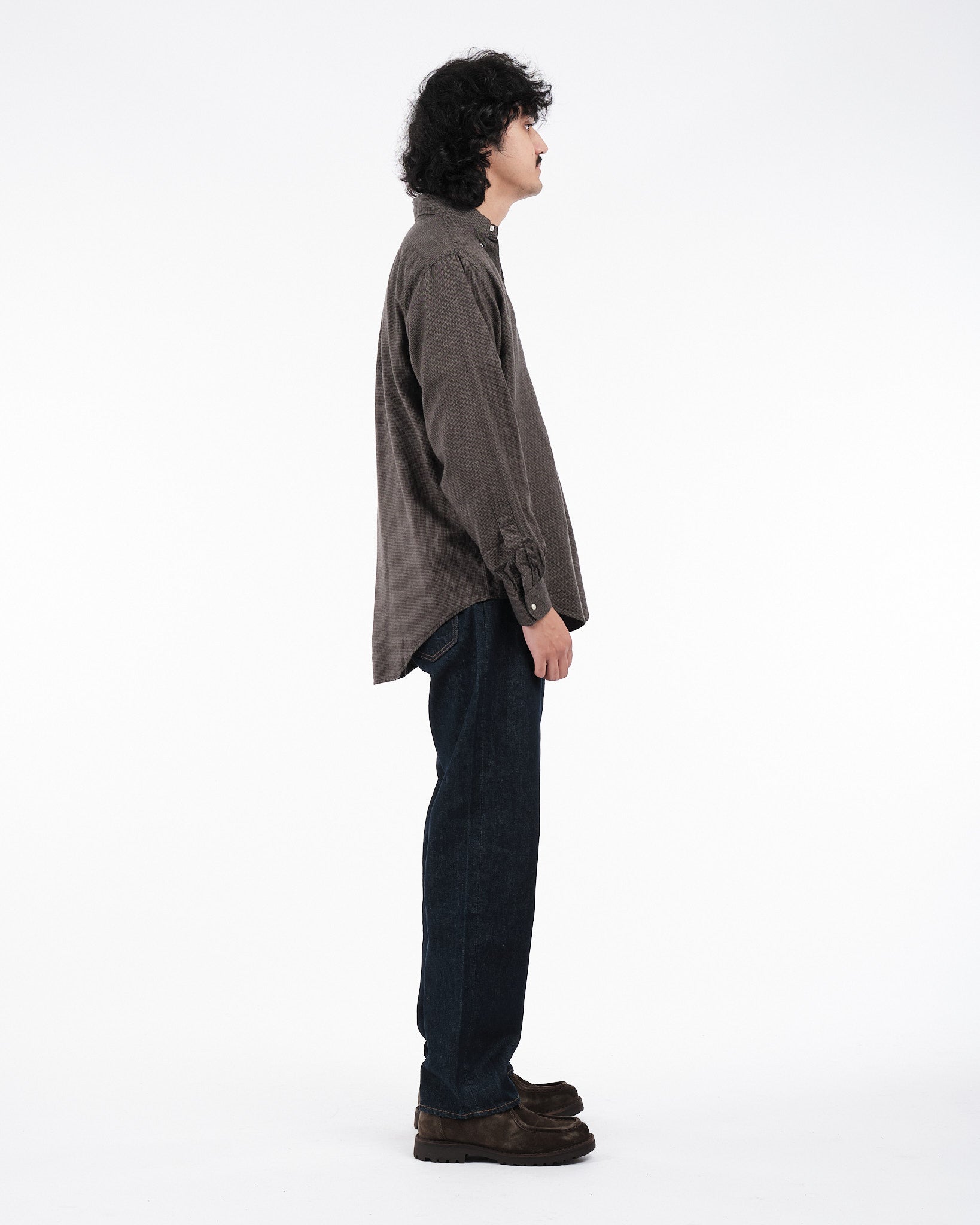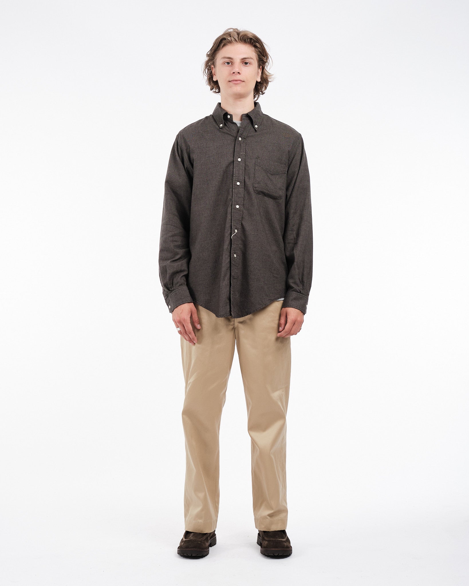 Présentation de la Chemise Boutonnée Standard Gris Charbon Orslow, fabriquée au Japon. Cette chemise est créée à partir d'un mélange de tissus en coton et lyocell avec un motif à micro carreaux offrant une sensation légère mais robuste. Le col classique boutonné, orné de boutons en Nacre apporte une élégance intemporelle à cette pièce essentielle du vestiaire. Parfaite pour les saisons changeantes, cette chemise garantit à la fois confort et style sans compromis.