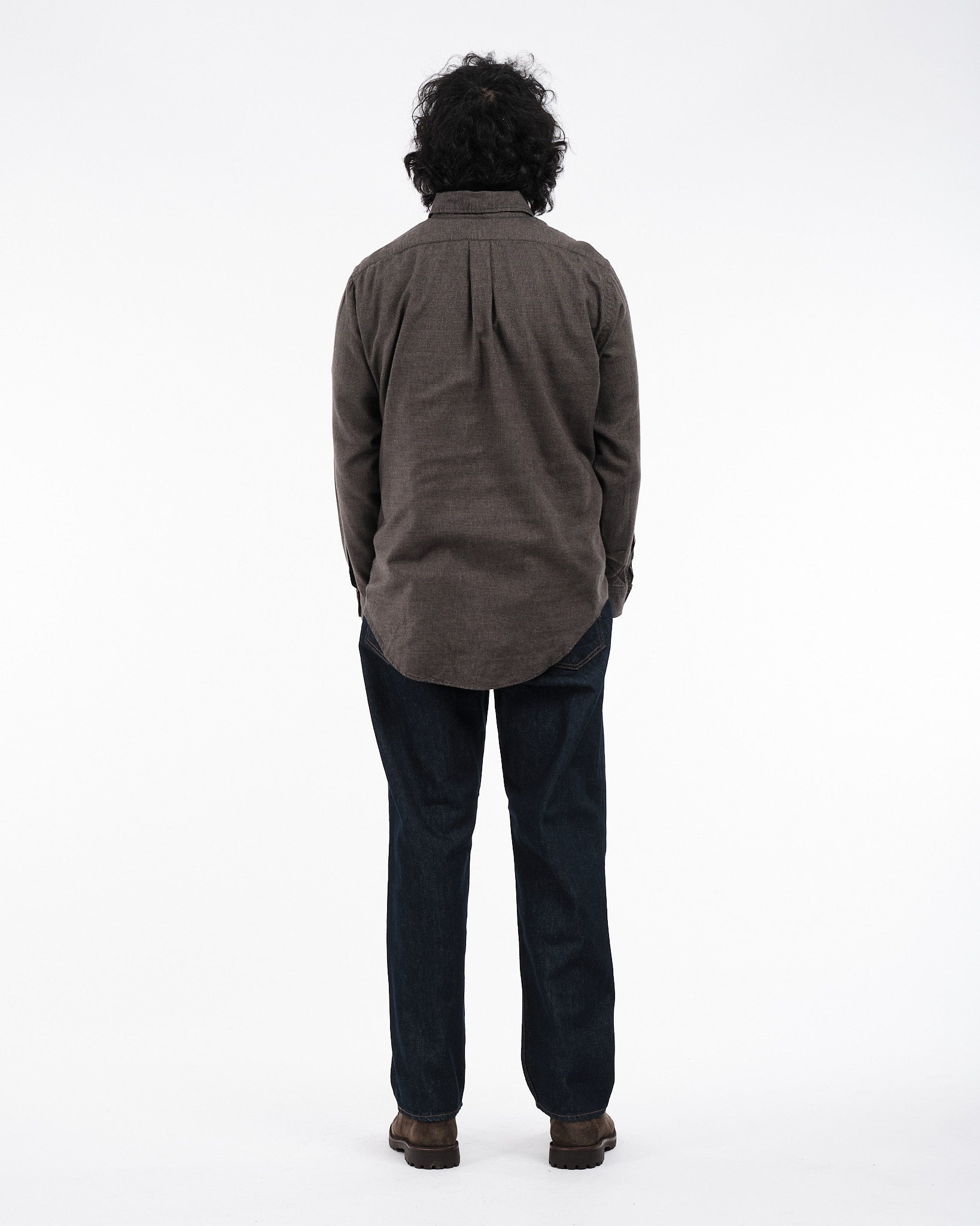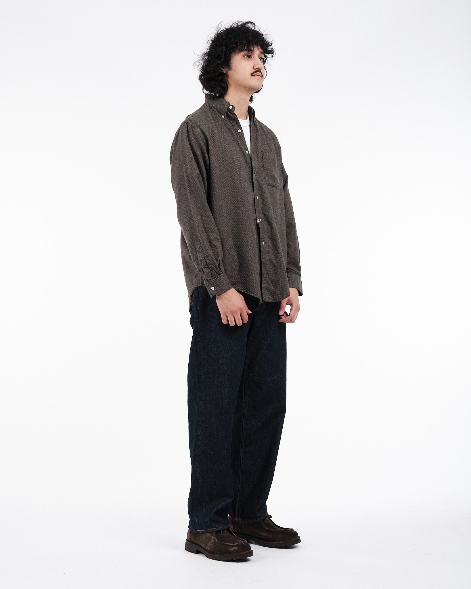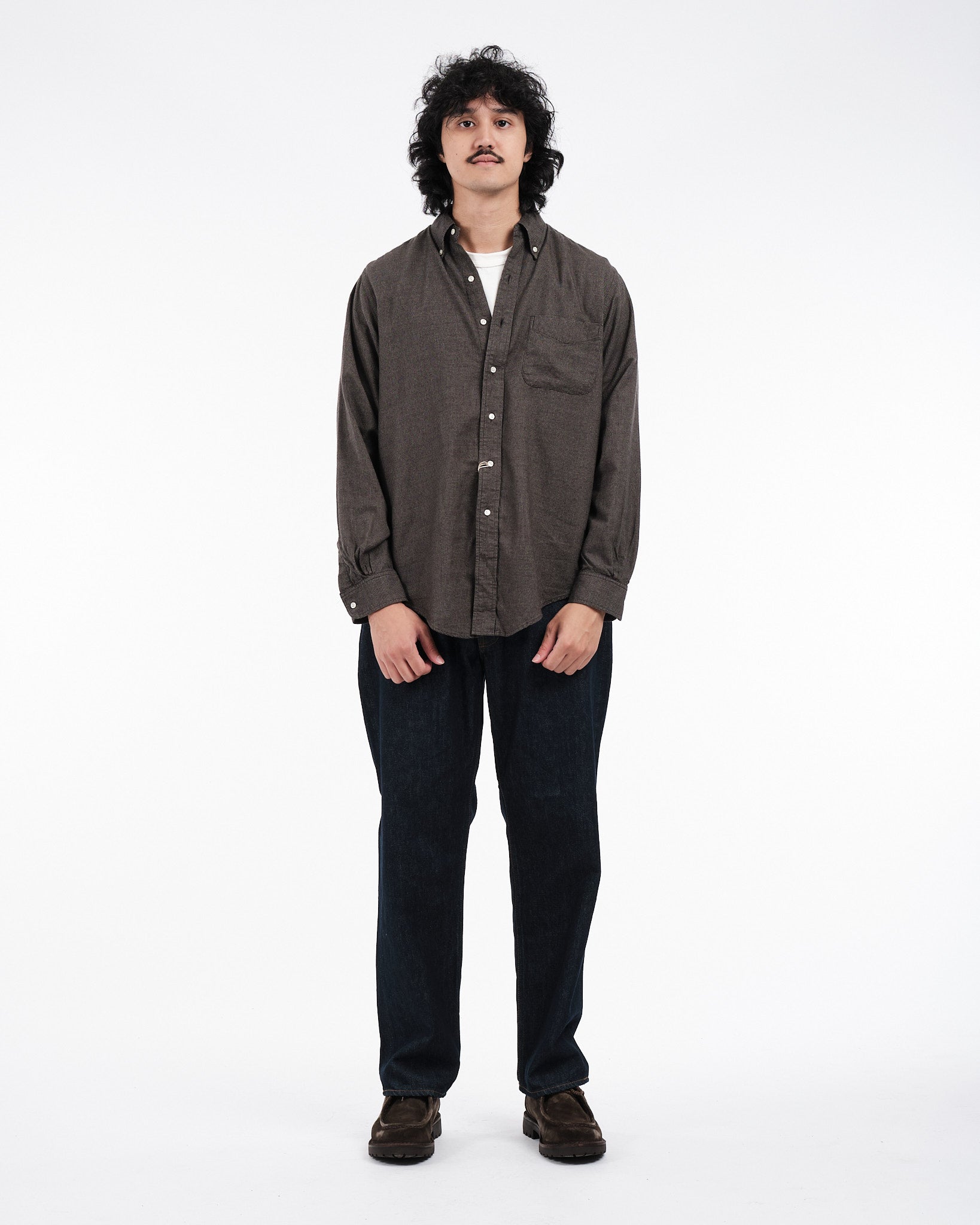 Présentation de la Chemise Boutonnée Standard Gris Charbon Orslow, fabriquée au Japon. Cette chemise est créée à partir d'un mélange de tissus en coton et lyocell avec un motif à micro carreaux offrant une sensation légère mais robuste. Le col classique boutonné, orné de boutons en Nacre apporte une élégance intemporelle à cette pièce essentielle du vestiaire. Parfaite pour les saisons changeantes, cette chemise garantit à la fois confort et style sans compromis.
