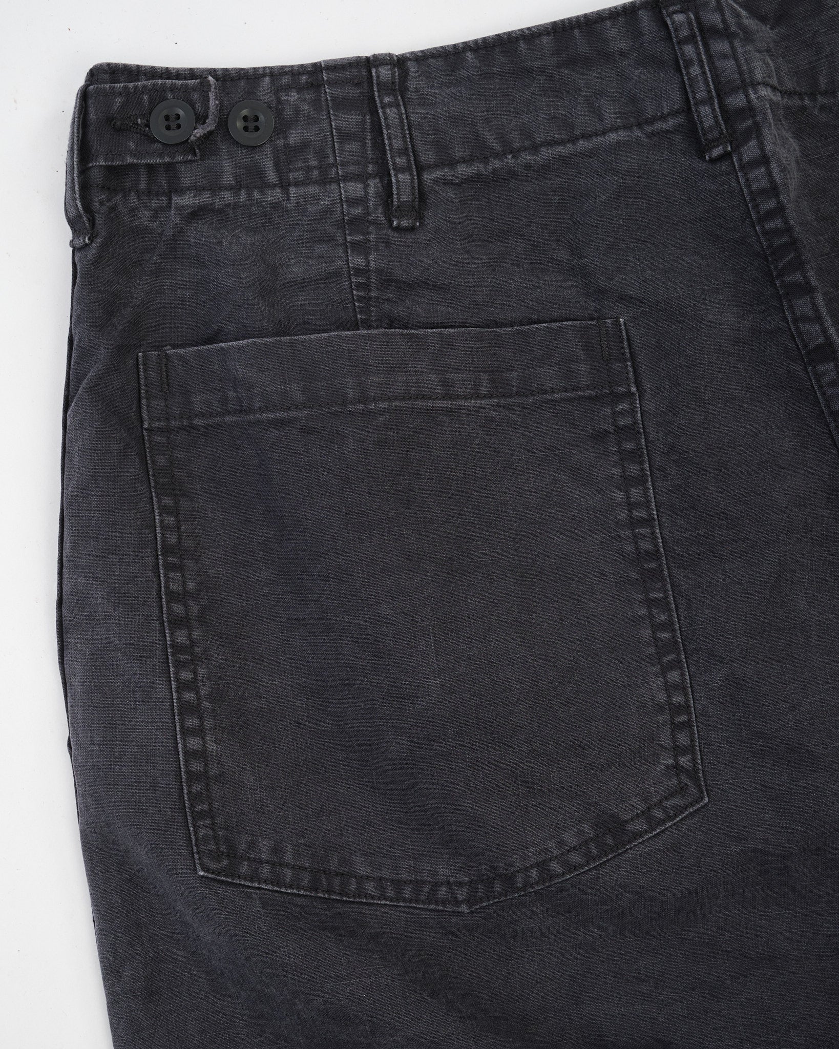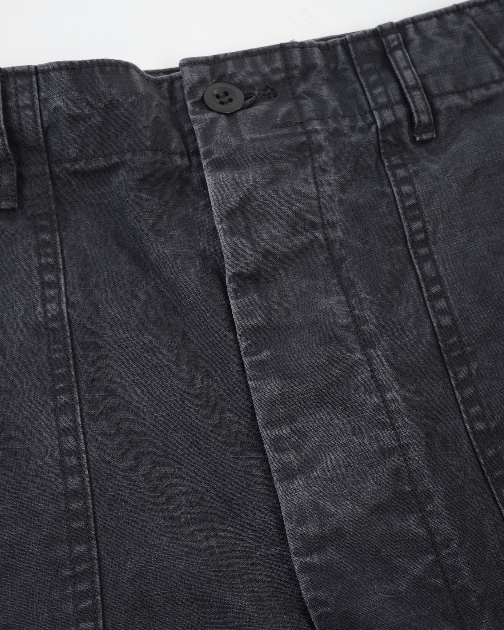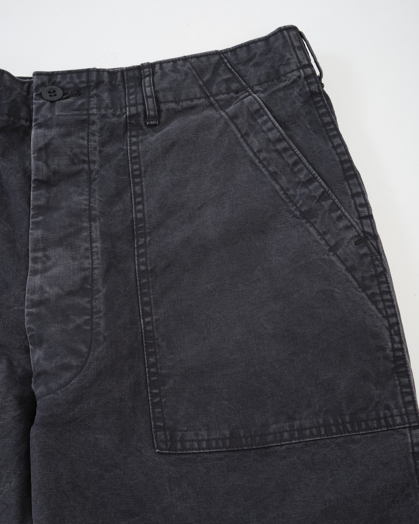 Le Pantalon de Fatigue Noir d'Été de orSlow apporte une utilité robuste dans une palette plus urbaine. Cousu au Japon à partir de sergé de coton chevron lavé, ils offrent une surface texturée riche qui évolue avec le temps et l'usure.