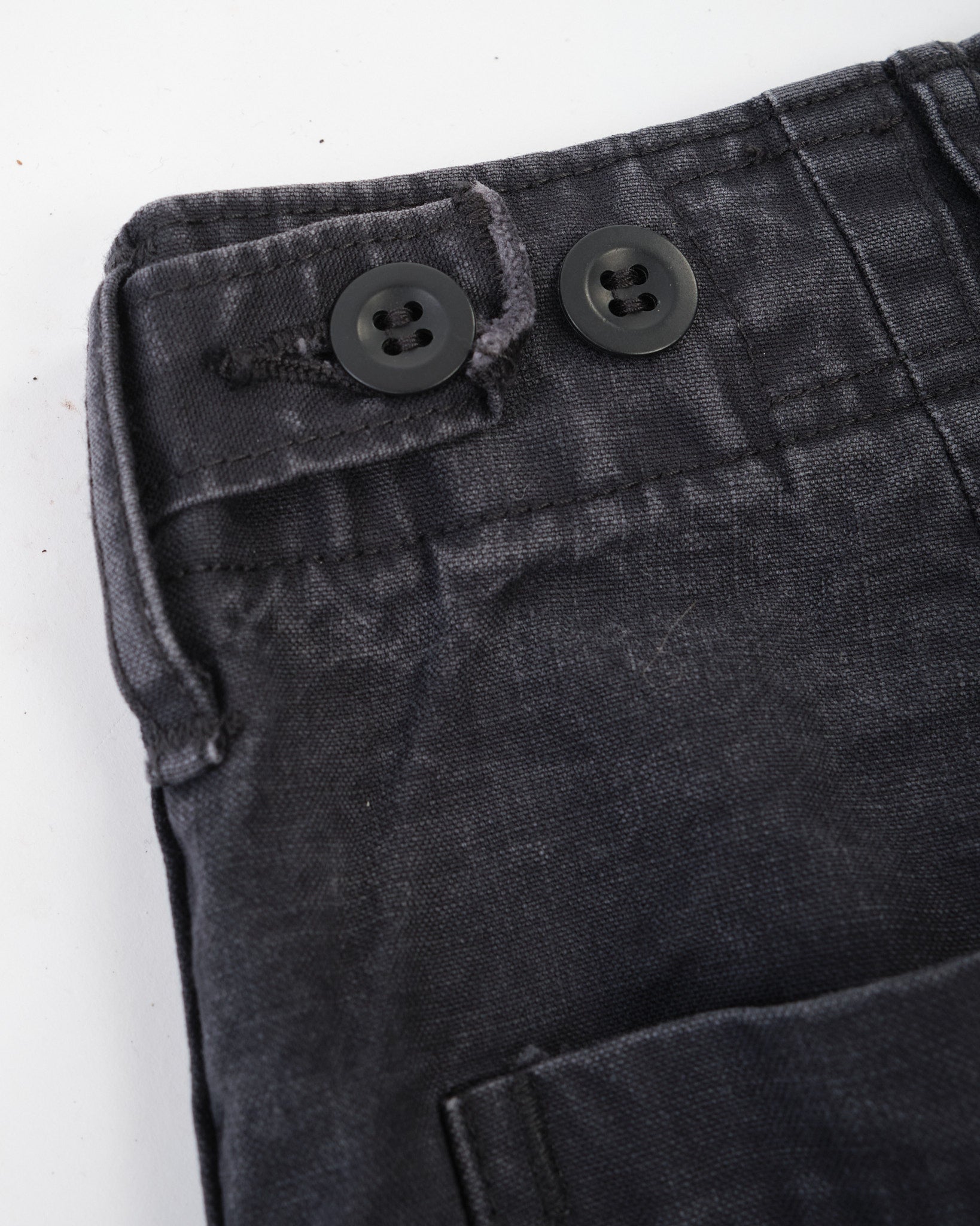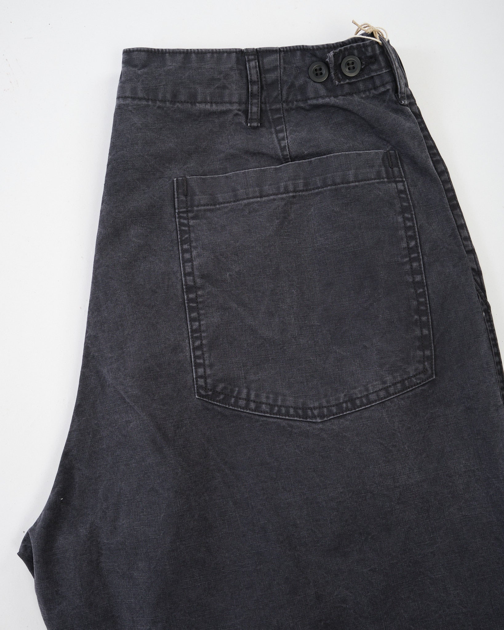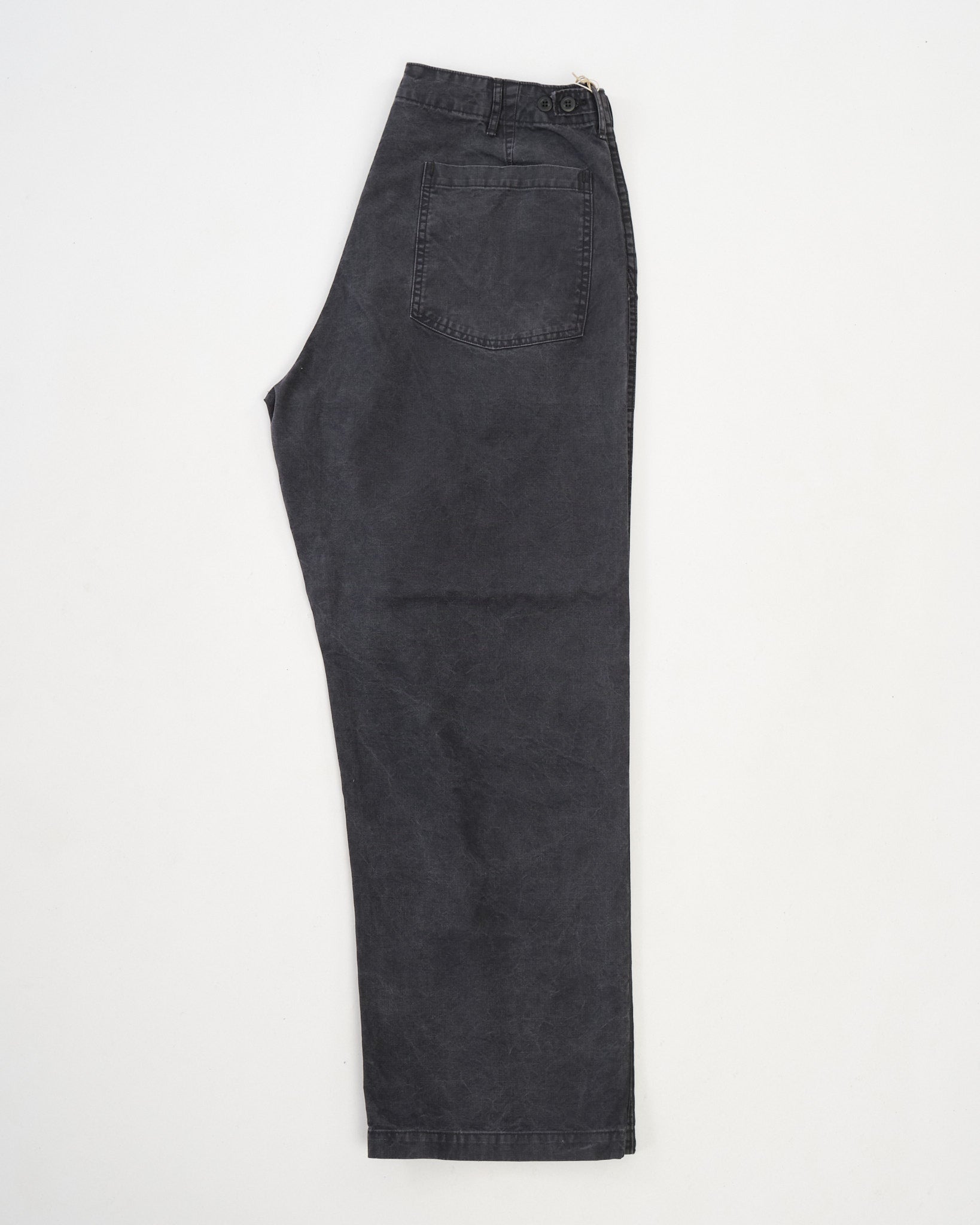 Le Pantalon de Fatigue Noir d'Été de orSlow apporte une utilité robuste dans une palette plus urbaine. Cousu au Japon à partir de sergé de coton chevron lavé, ils offrent une surface texturée riche qui évolue avec le temps et l'usure.