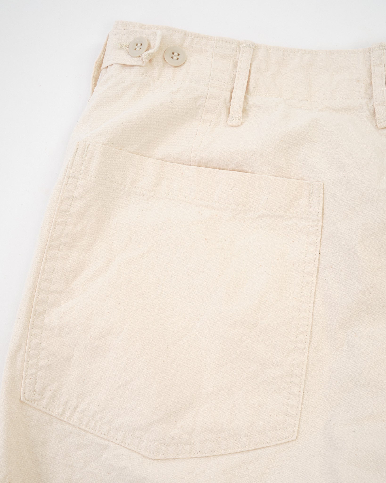 Les Shorts de Fatigue d'Été Écru offrent une option neutre, légère et polyvalente. Fabriqués au Japon à partir de sergé de coton herringbone lavé, ils apportent douceur, délavage vintage et texture respirante à votre garde-robe d'été.