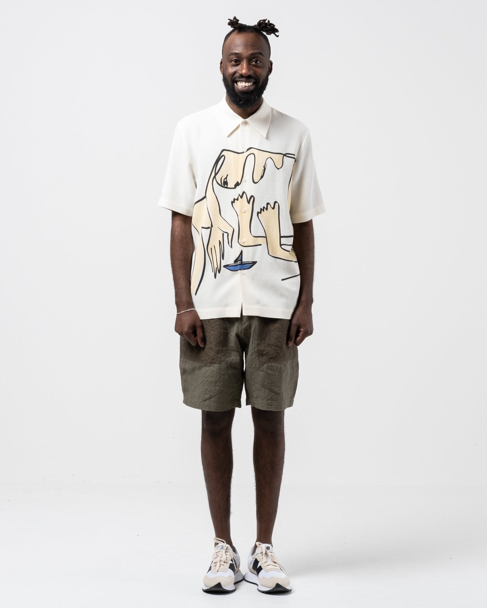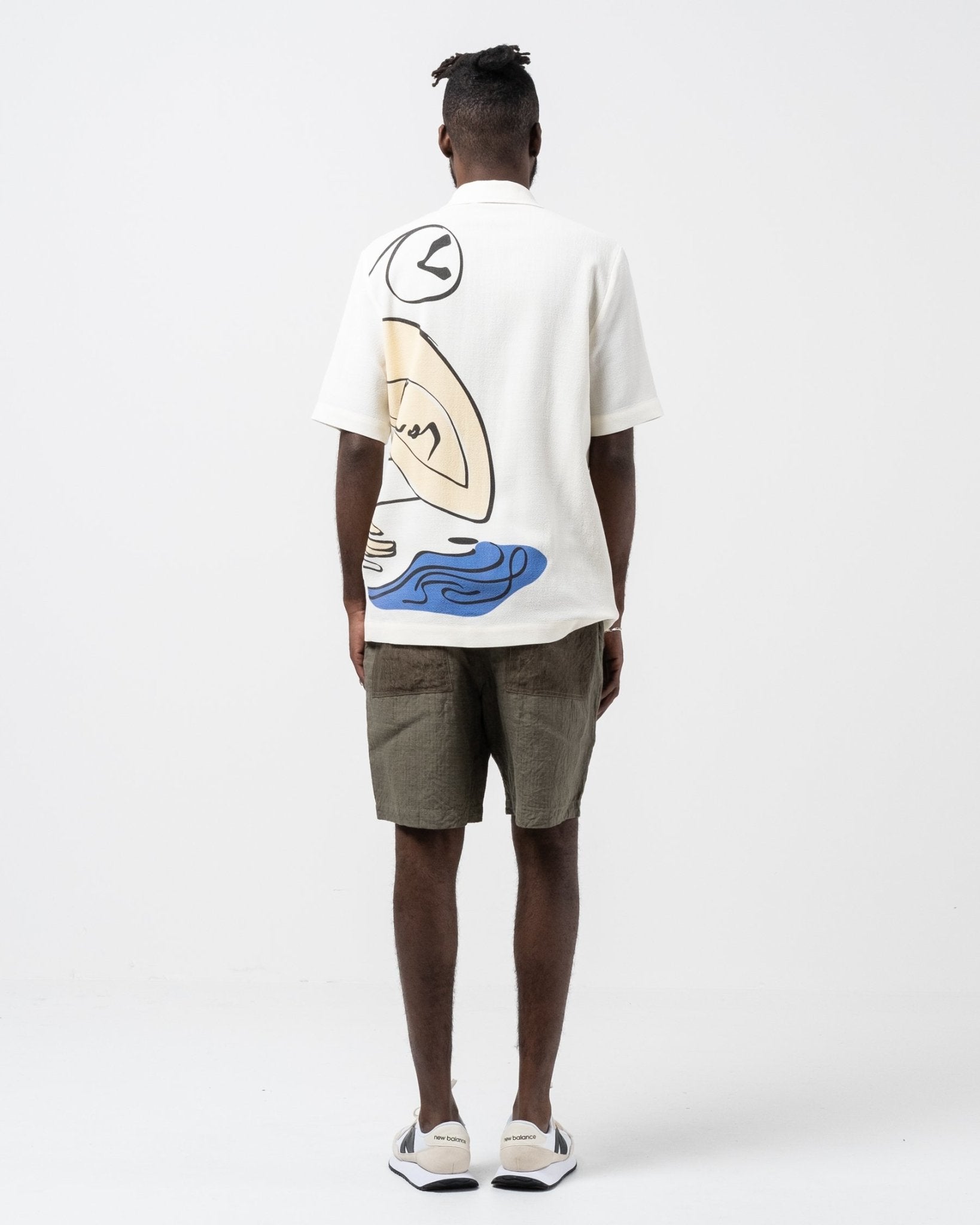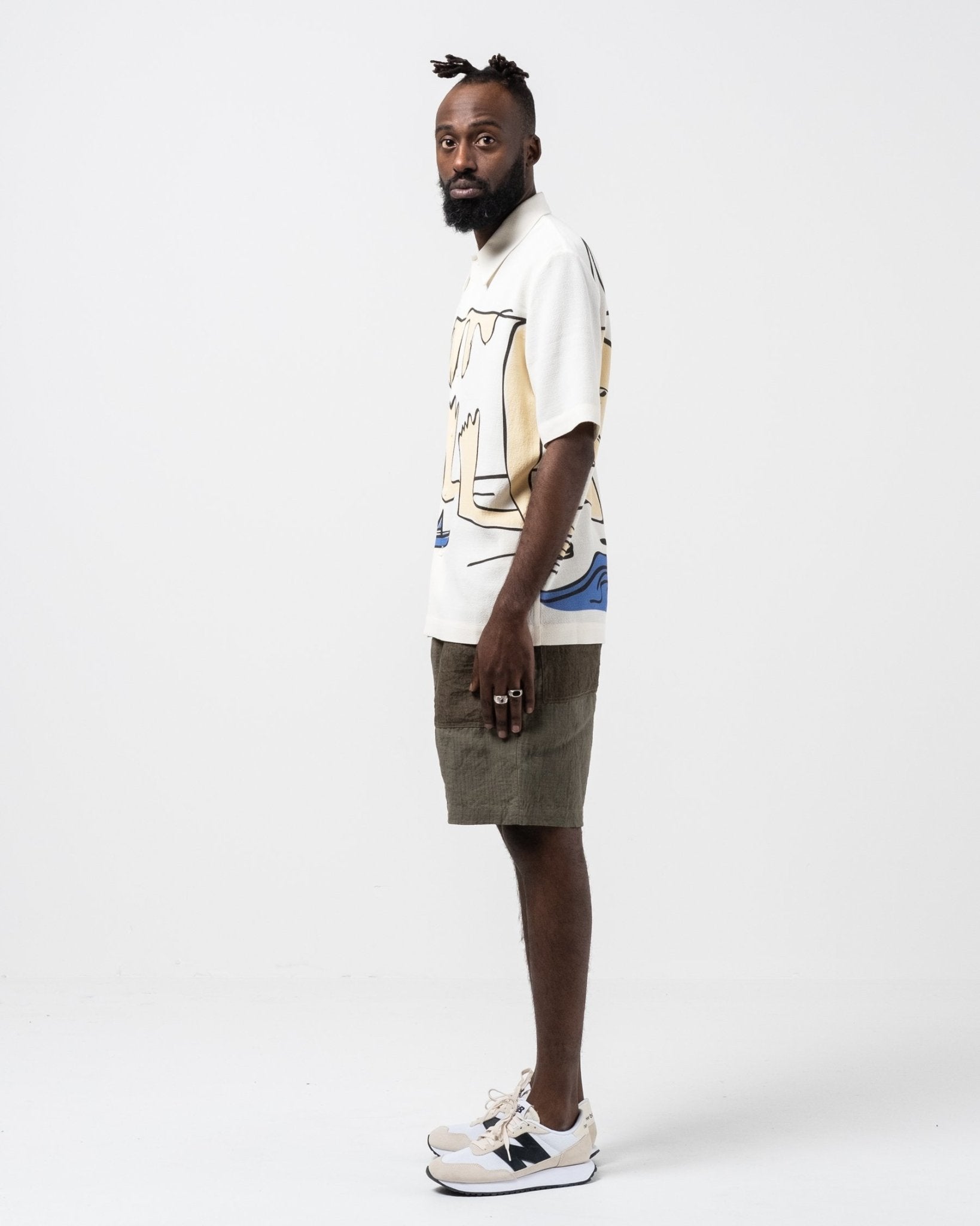 SUNEHAM Shirt Union Print de Séfr. Merde à manches courtes avec un collier droit et un col large. Beau tissu dans un tissage de crêpe à laine viscose et des boutons de la mère de perles d'Italie. Imprimé syndical par l'artiste de Malmö Therese Wendt. Fait en Lettonie.