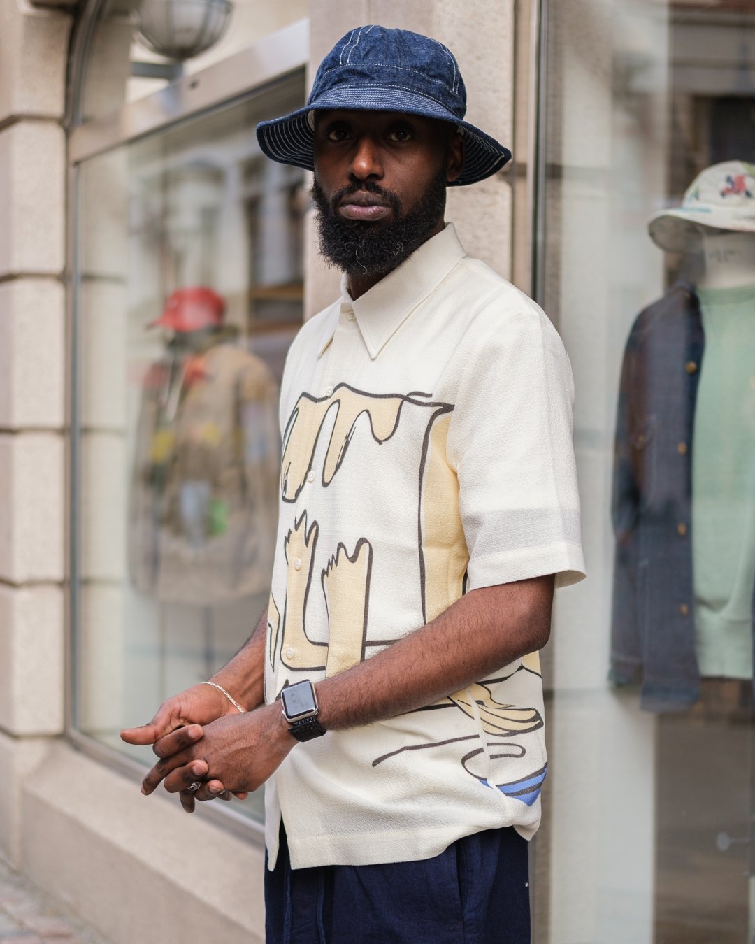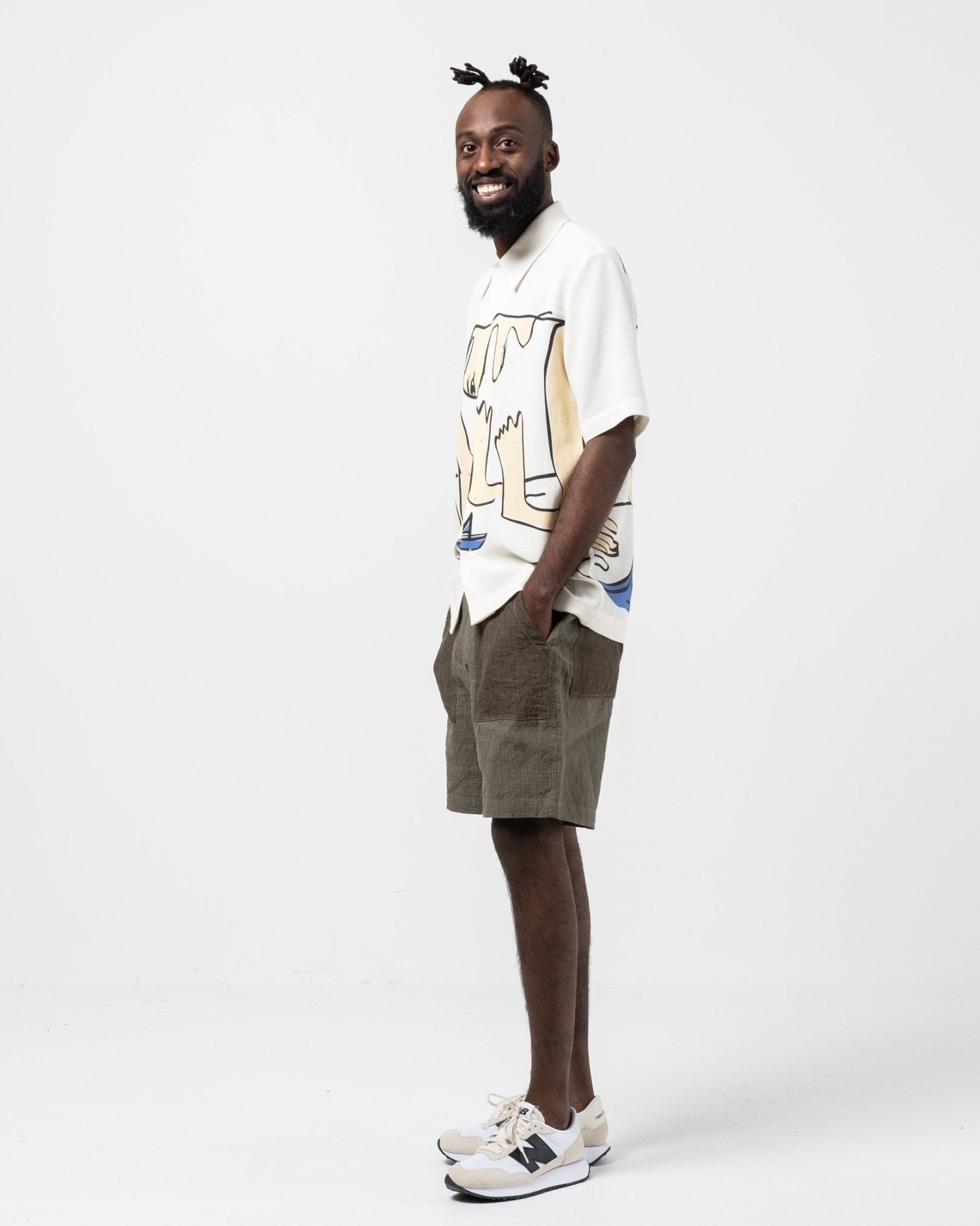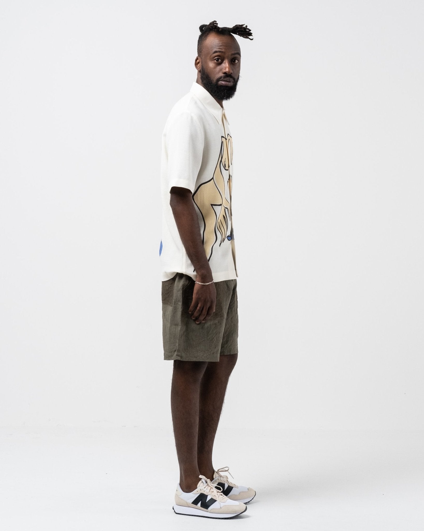 SUNEHAM Shirt Union Print de Séfr. Merde à manches courtes avec un collier droit et un col large. Beau tissu dans un tissage de crêpe à laine viscose et des boutons de la mère de perles d'Italie. Imprimé syndical par l'artiste de Malmö Therese Wendt. Fait en Lettonie.