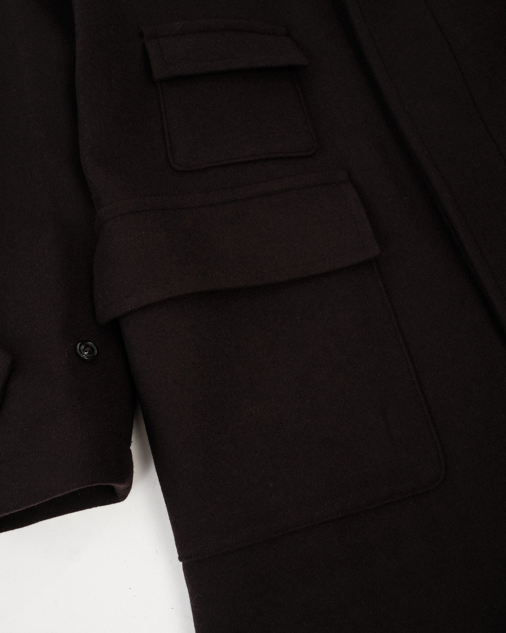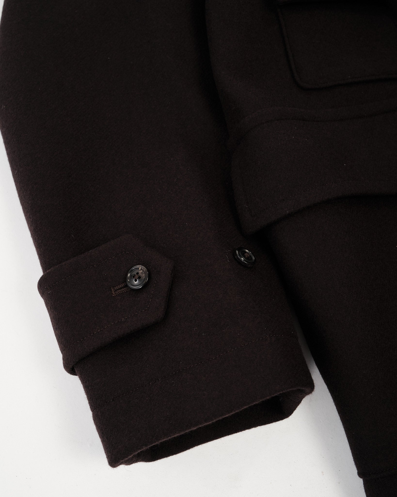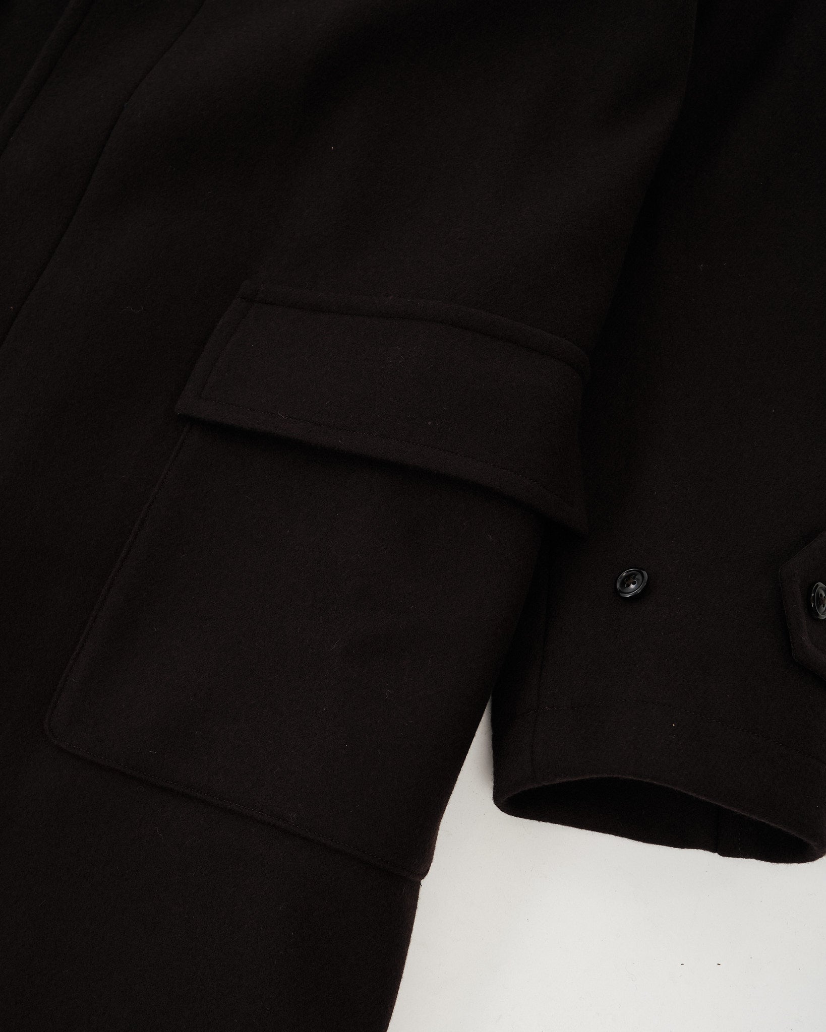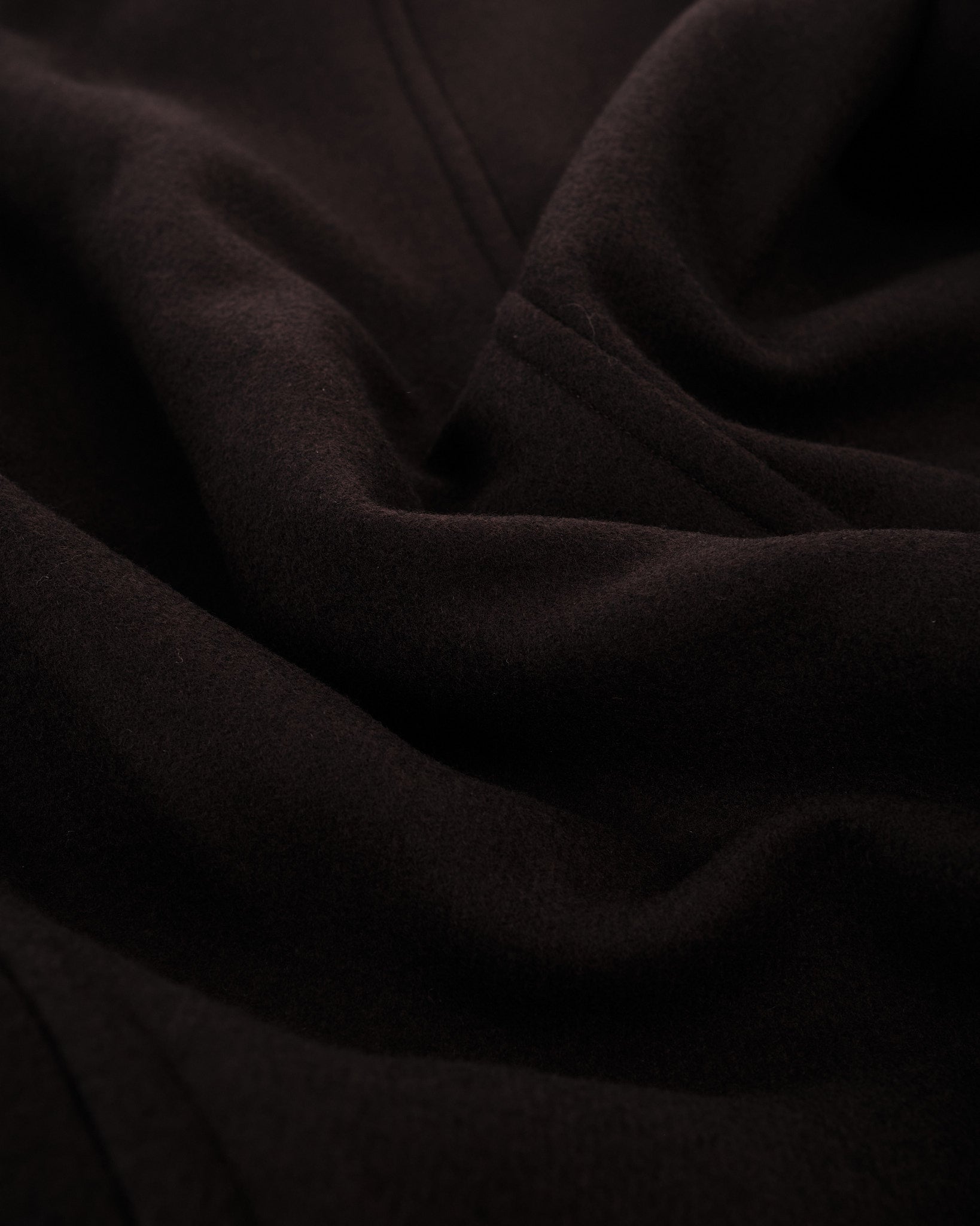 Le Manteau de voyage de Kaptain Sunshine (KS25FCO03) dans Brun combinaison luxe et fonctionnalité sans couture. Fait à partir d'un Melton à double tissu inversé, ce manteau est tissé avec Fibres de laine Ultra-Fine 16,5 microns Super140, offrant l'équilibre parfait de fermeté et légèreté. Le tissu est teint avec du coton pour obtenir un couleur riche et profonde, tandis que le tissage dense assure la douceur, éclatet élégant texture souple.