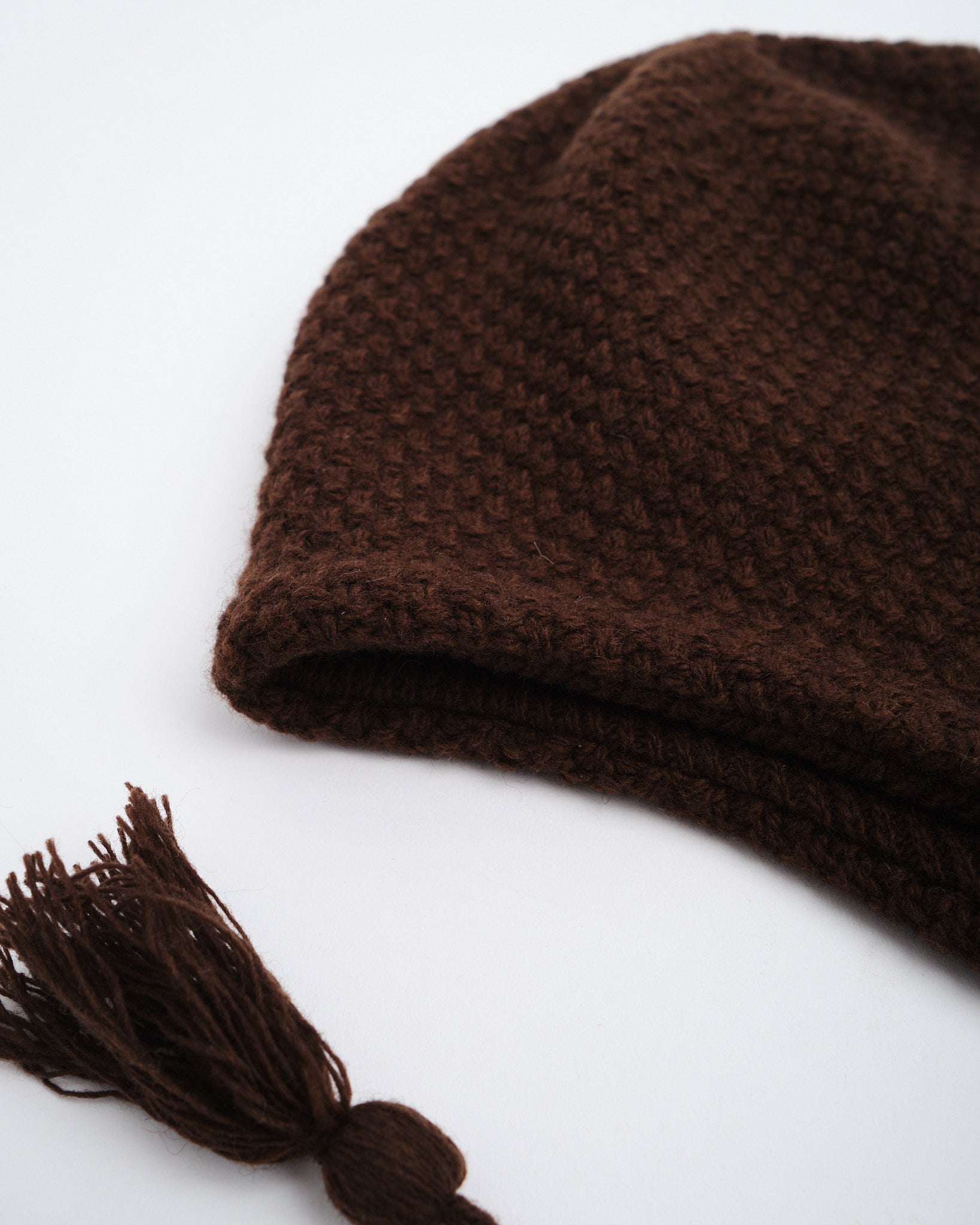 The Trek Beanie in Brown by Found Feather blends rustic charm with refined construction. Made in Japan from a washable lambswool blend, it features a dobby cable knit pattern and a brushed interior for enhanced softness. The extended 8.5 cm ear panels and self-yarn lace and tassels give it a cozy, alpine feel, while the one-panel design ensures a clean fit. Finished with a woven label and QR-coded care tag, this unisex beanie is ready for both mountain air and city chill.