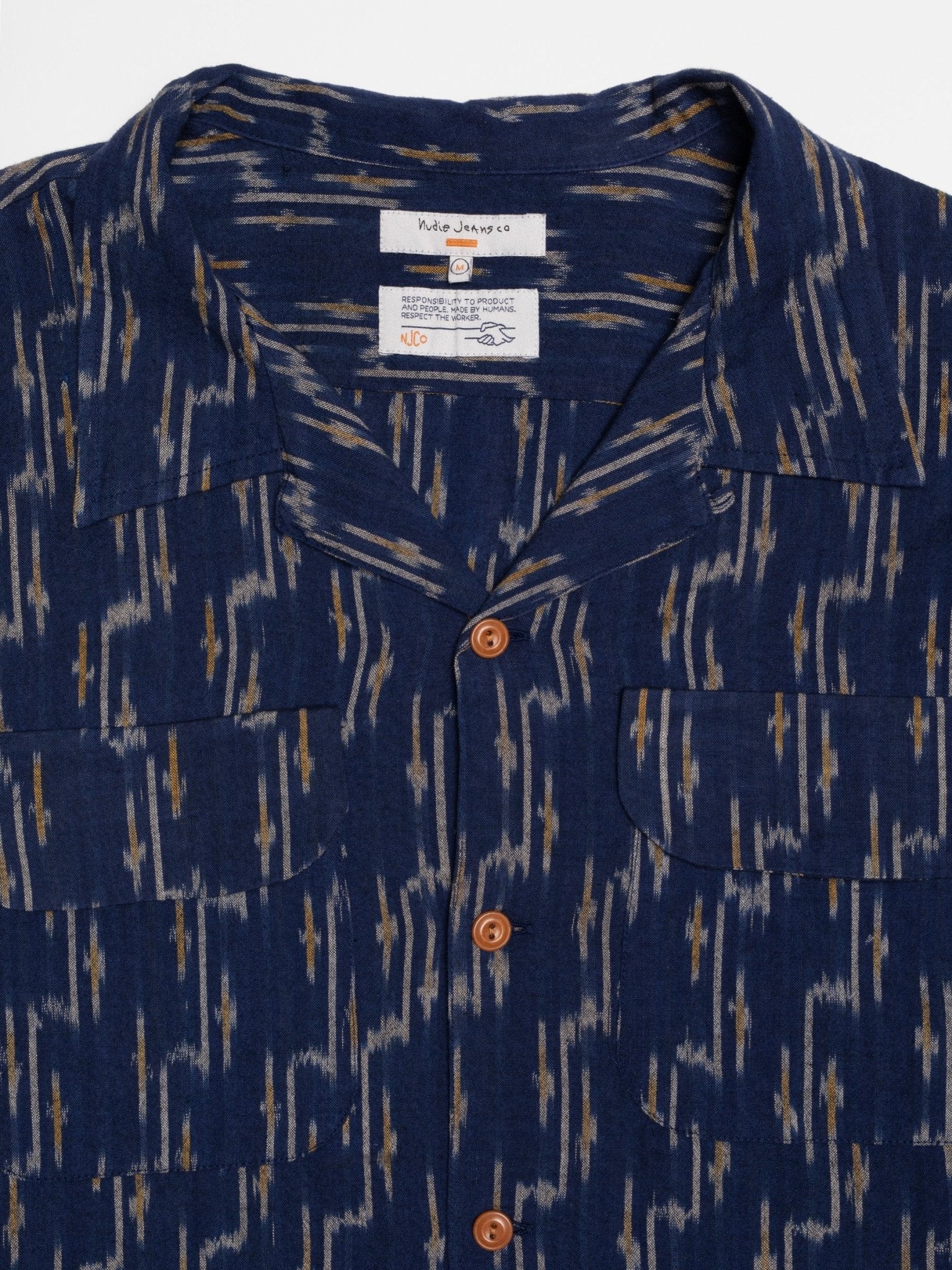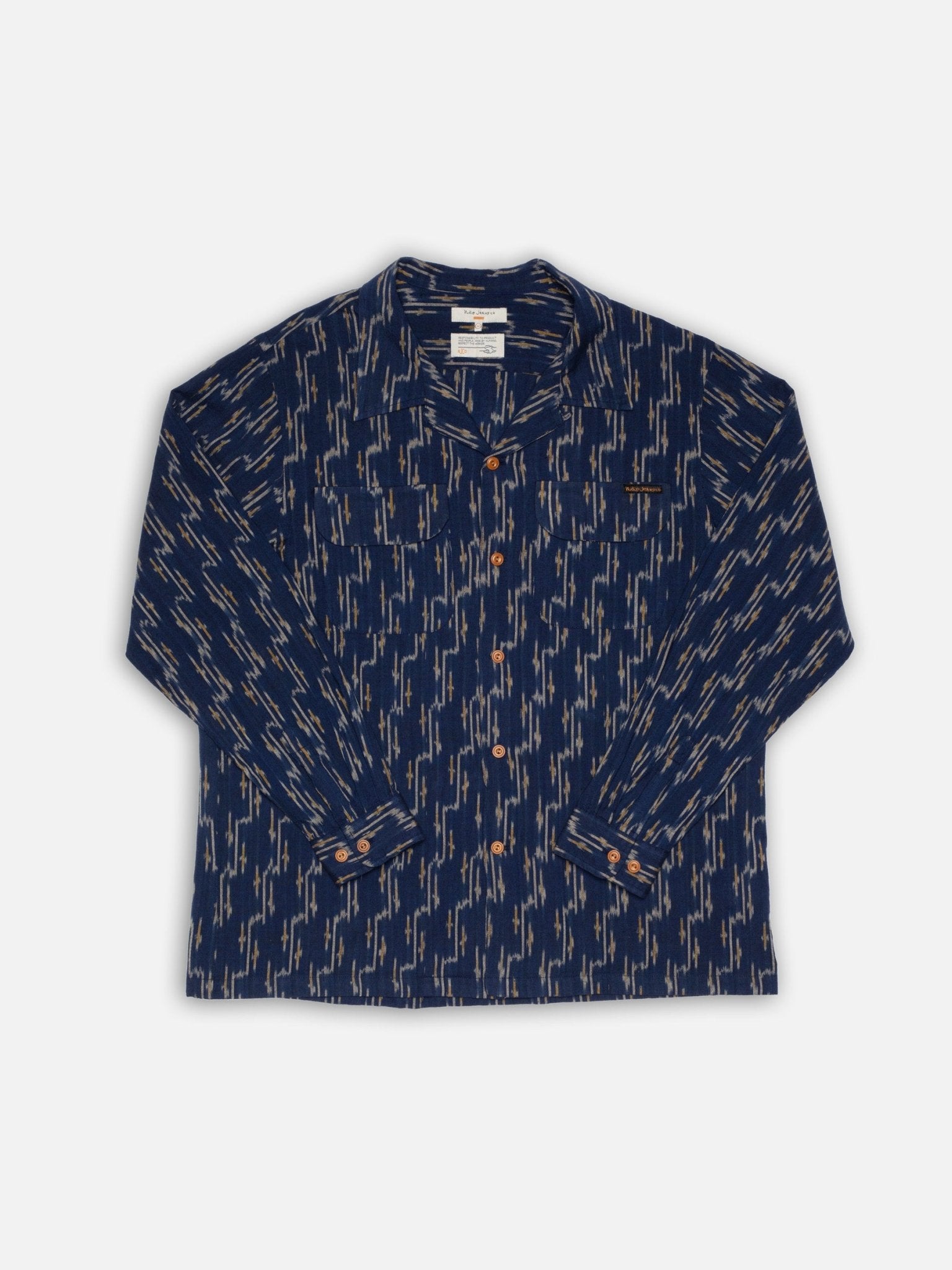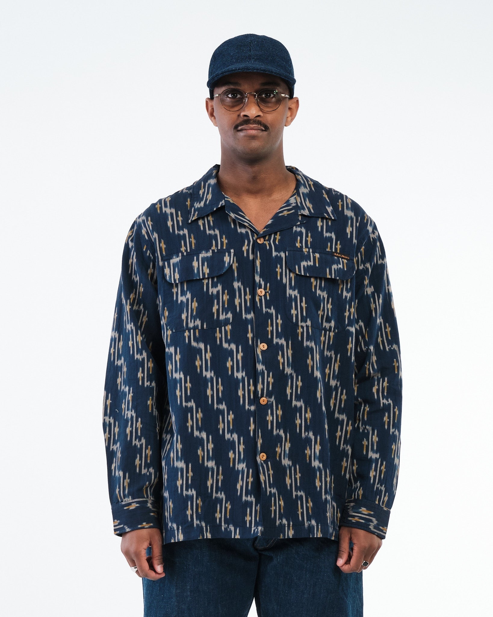Présentation du Vincent Ikat Shirt par Nudie Jeans Co—Un mélange harmonieux d'artisanat traditionnel et de style contemporain. Cette chemise propose un Modèle ikat Dans une riche teinte de myrtille, offrant un look distinctif et accrocheur.