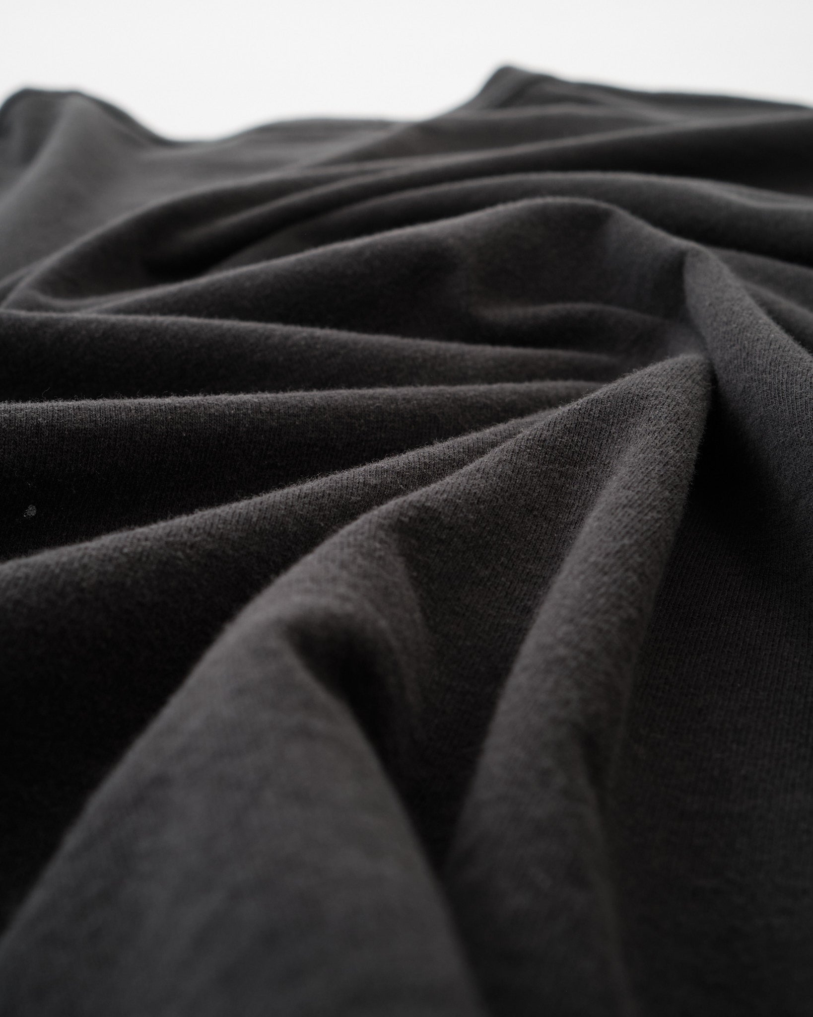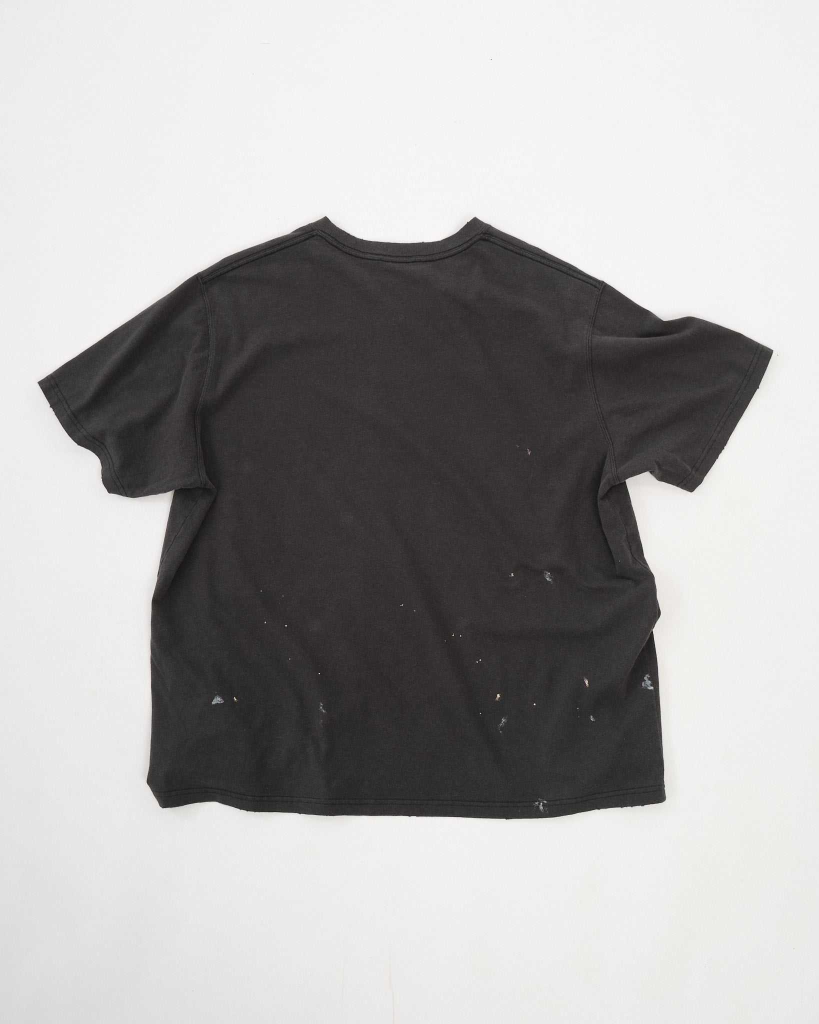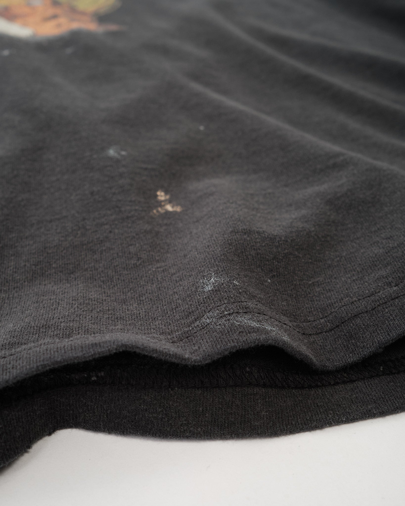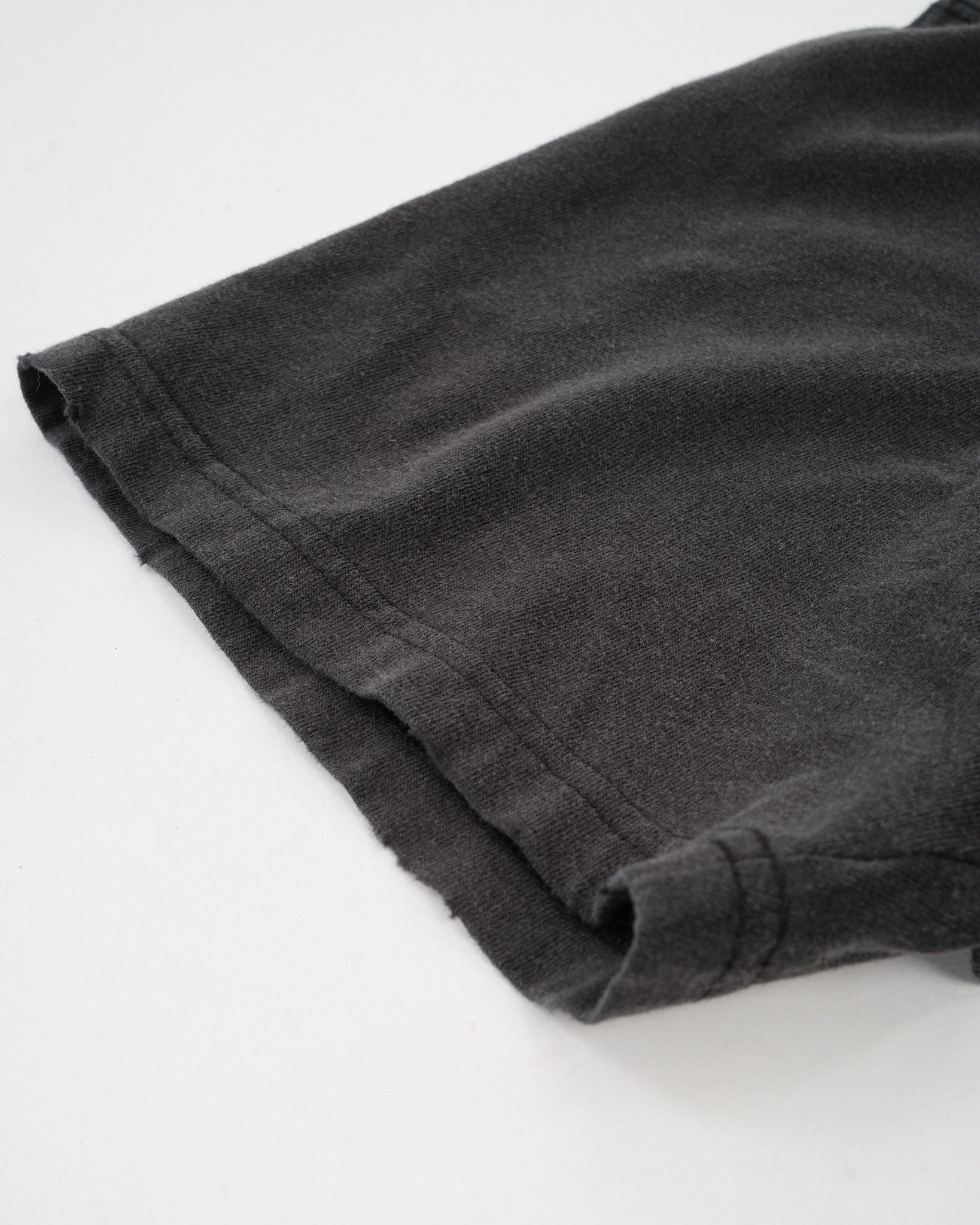Sur un fond noir lavé, les tons sont atténués et équilibrés, permettant au graphique de se démarquer subtilement. La silhouette décontractée le rend facile à porter seul ou superposé sous une chemise ou une veste.