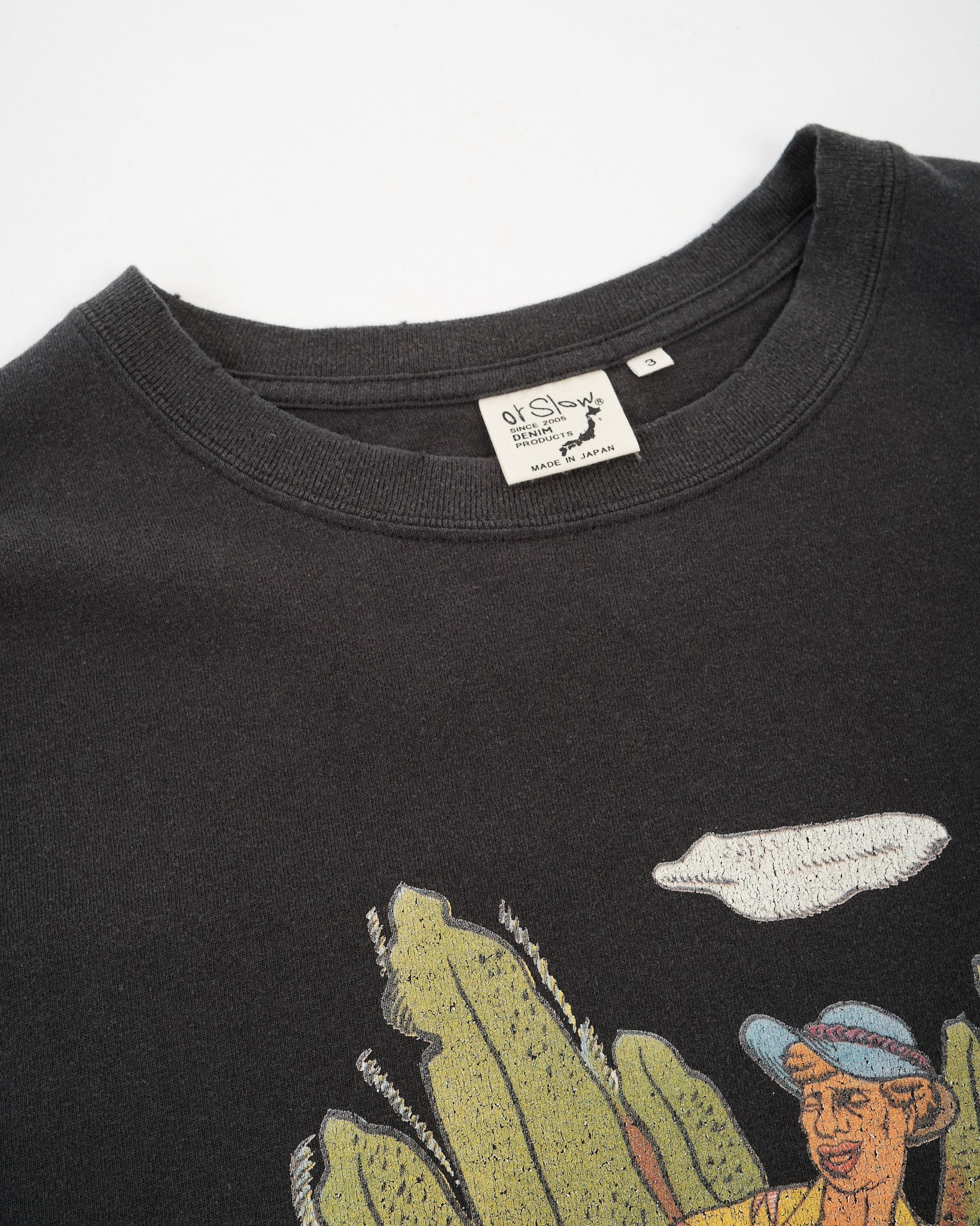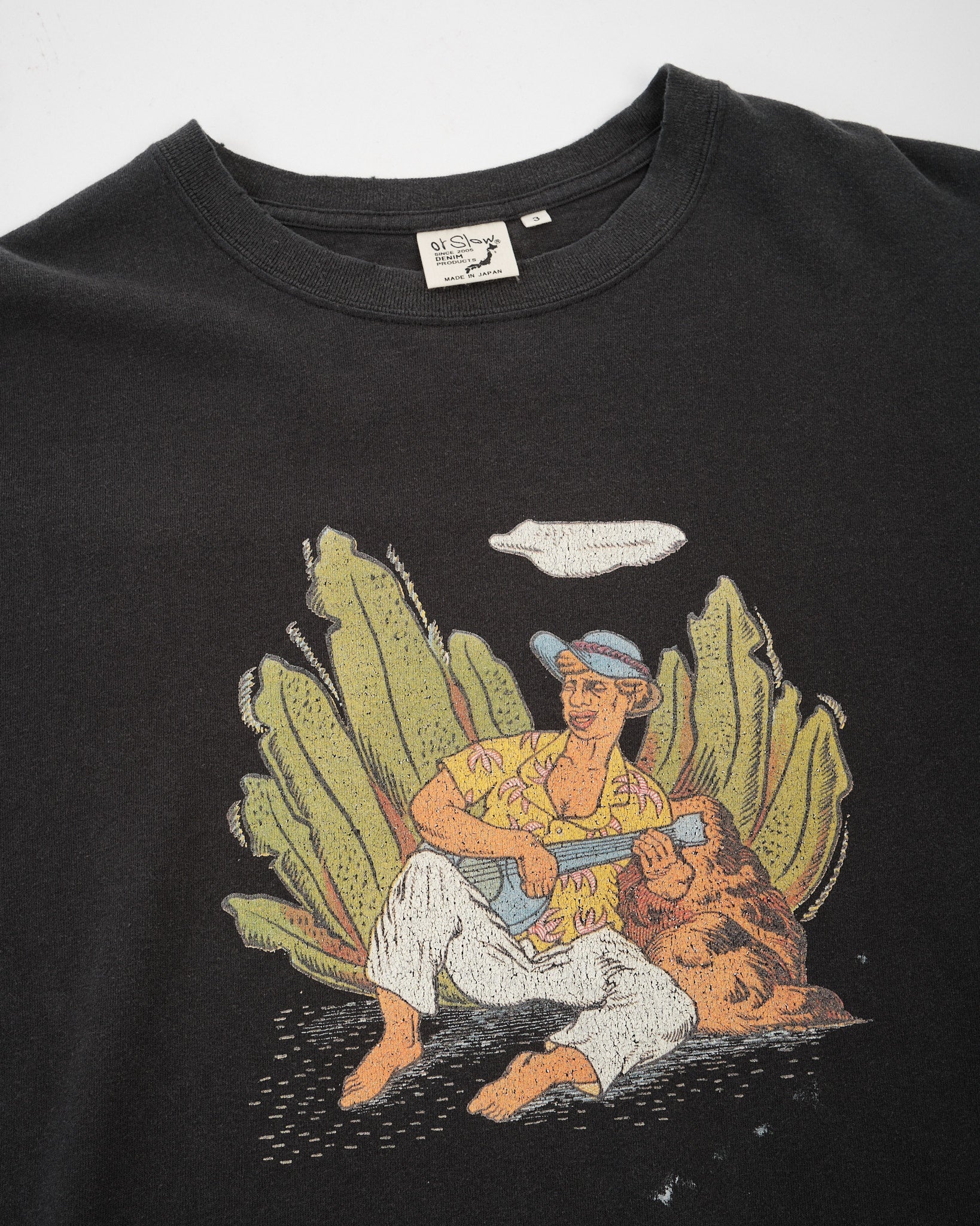 Fabriqué en jersey de coton doux, le tissu a un caractère naturellement usé qui complète l'impression graphique délavée. L'œuvre d'art inspirée d'Hawaï est intentionnellement vieillie, créant une expression authentique et usée plutôt qu'un aspect net et nouvellement imprimé.